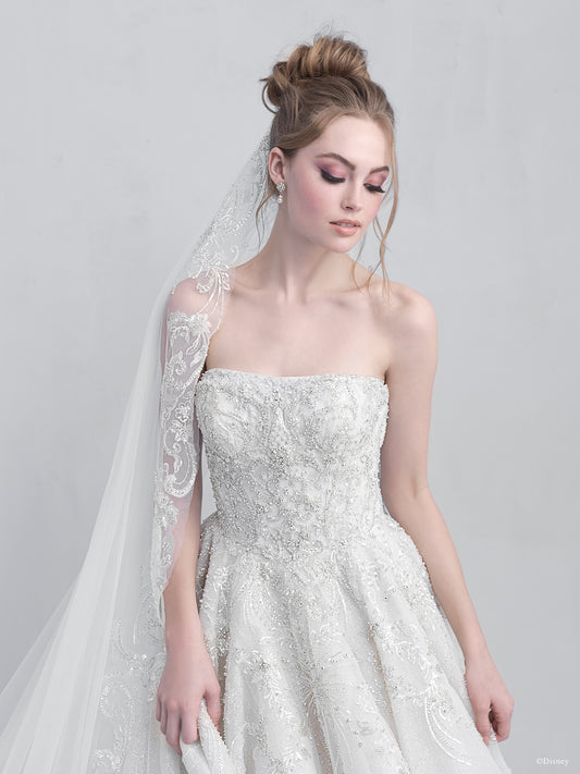 Des appliqués de dentelle chatoyante ajoutent texture et richesse à la dentelle ivoire de cette ravissante robe de bal, inspirée de Cendrillon de Disney. Elle est également dotée de mancherons en dentelle translucide et d'un décolleté en cœur délicat sur le corsage. Présentée avec le voile assorti DV33, vendu séparément.