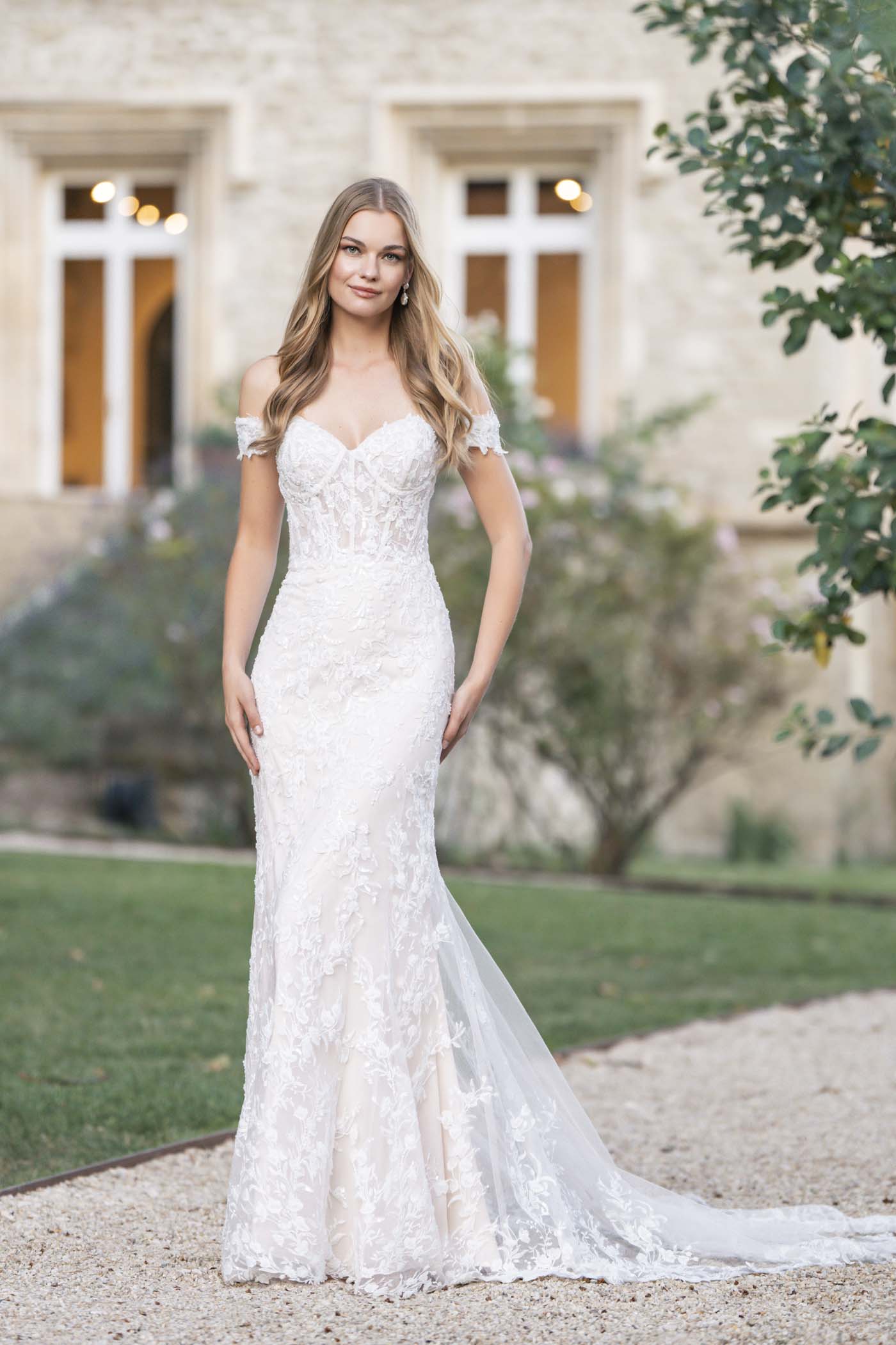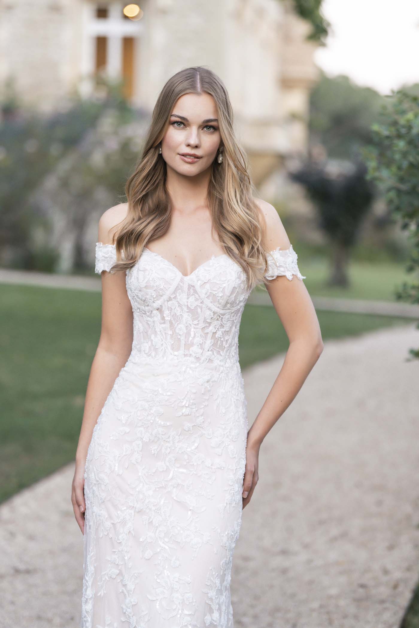Cette robe fourreau à épaules dénudées tout à fait romantique est ornée d'appliques en dentelle pailletées et perlées.