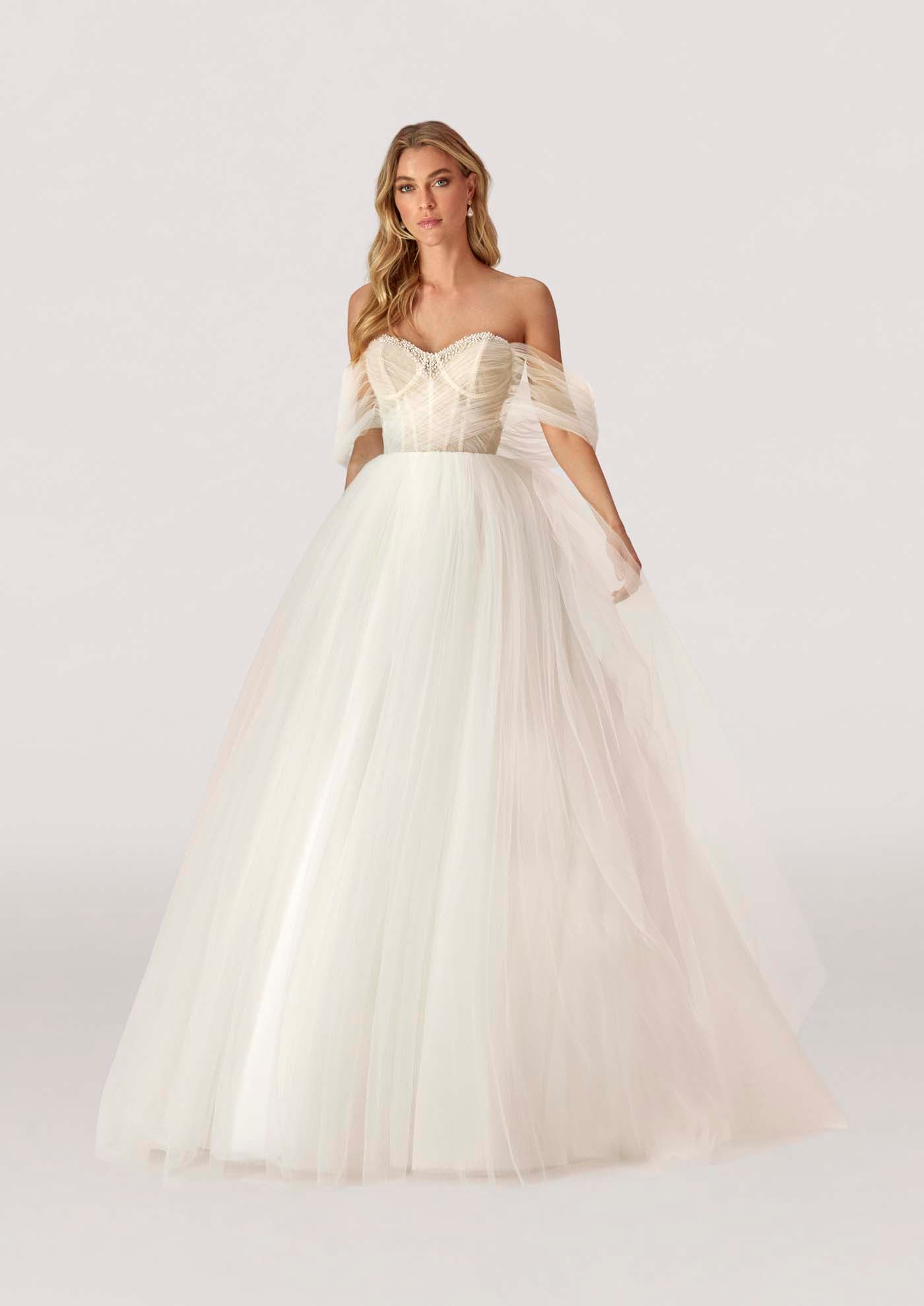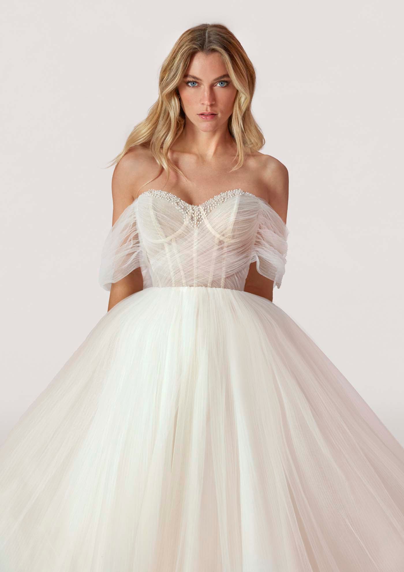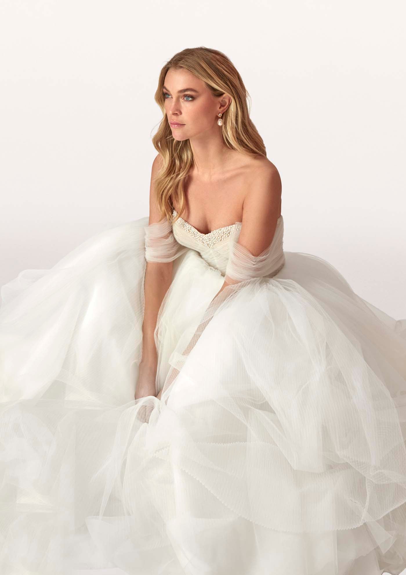 Les plus belles couches de tulle accordéon composent la robe de bal Greta, avec un décolleté en cœur orné de bijoux qui mène à des manches en tulle vaporeuses et à épaules dénudées.