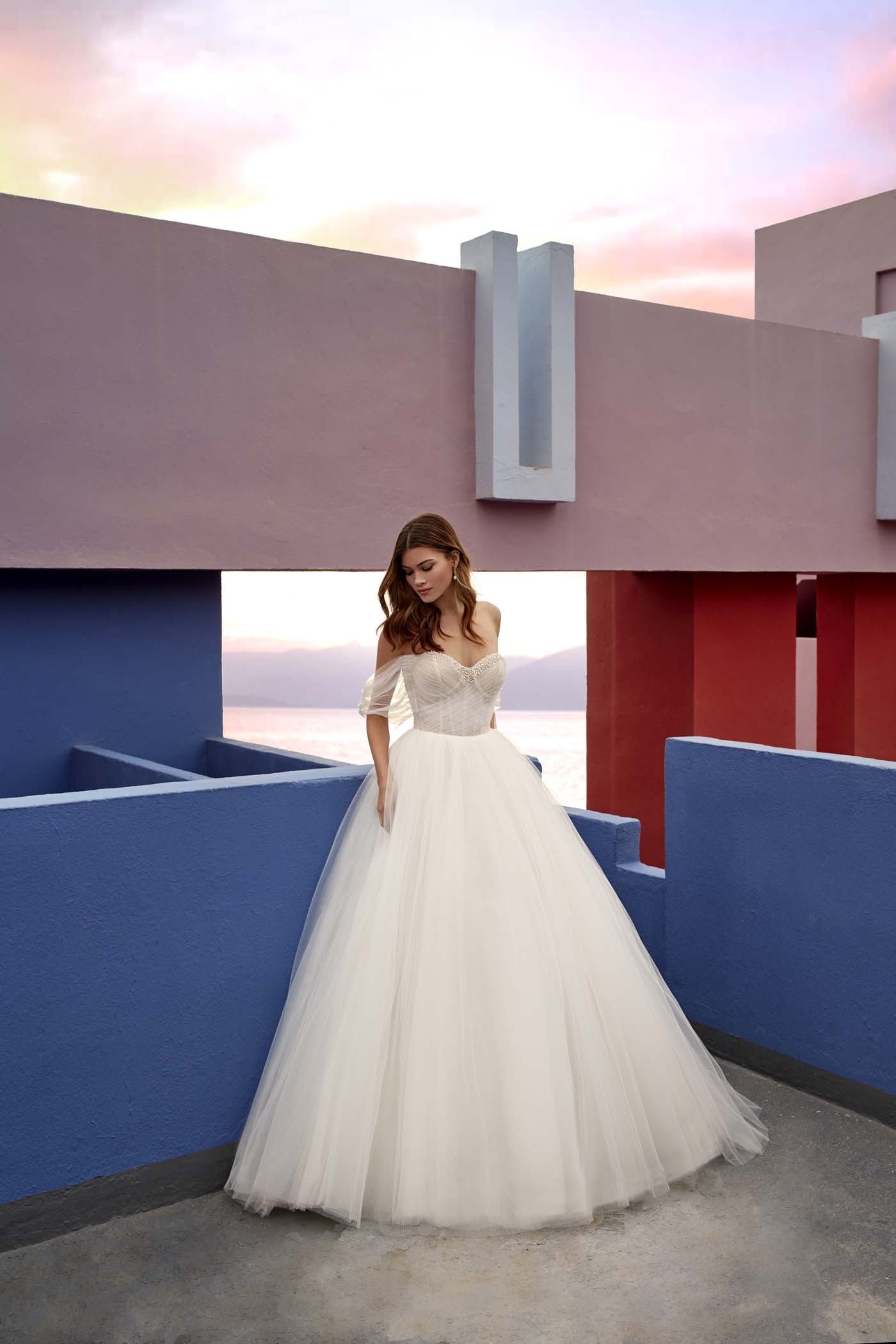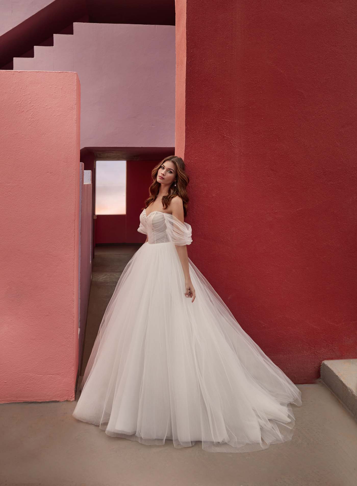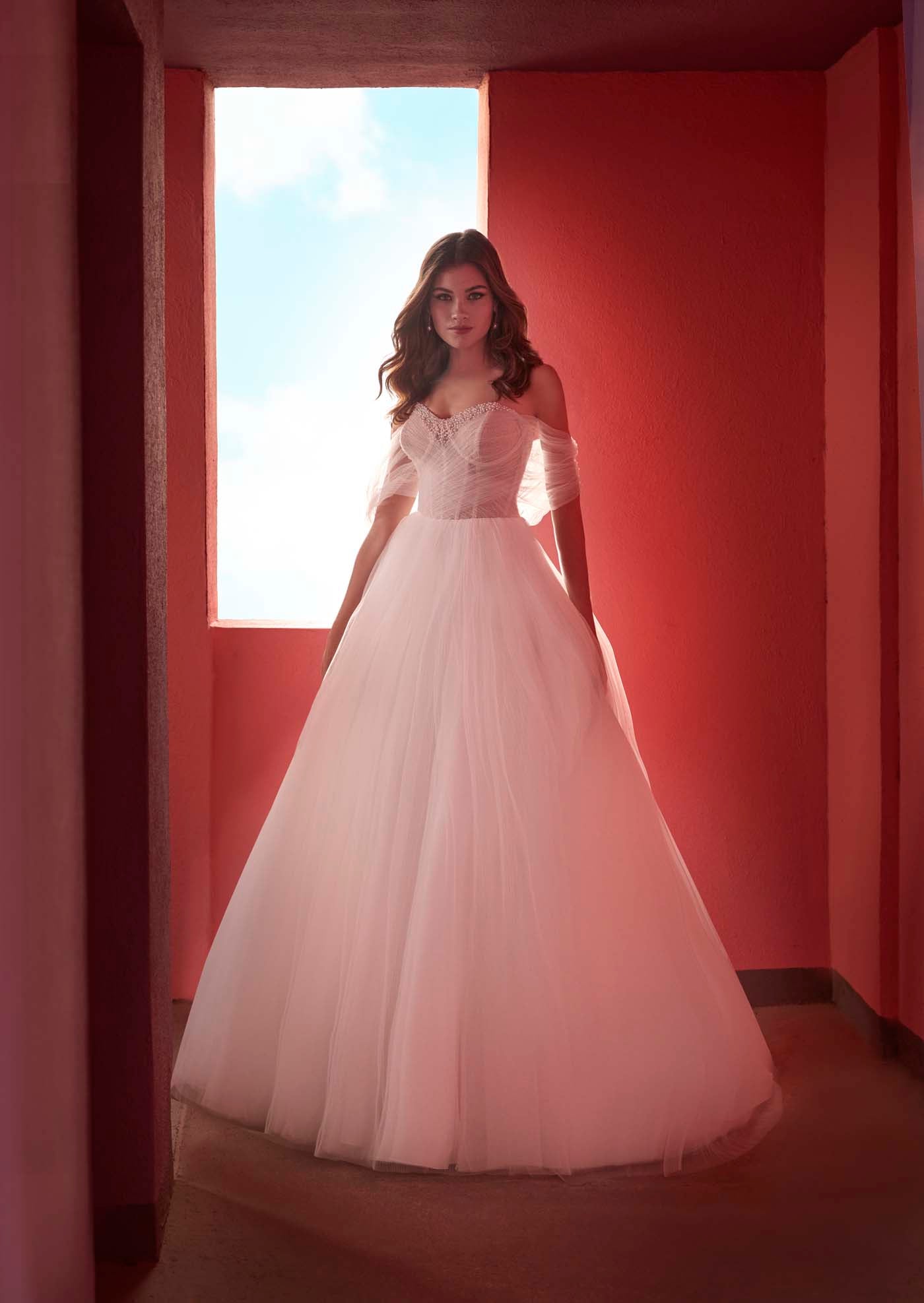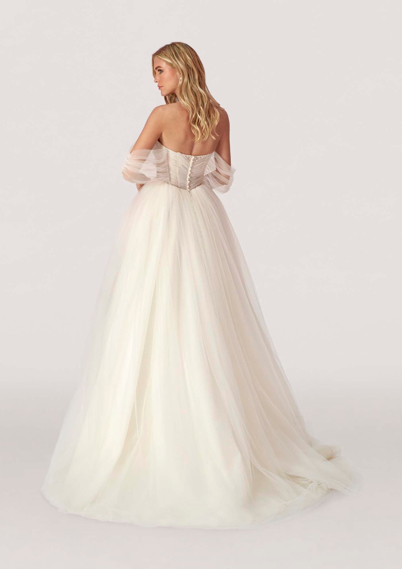 Les plus belles couches de tulle accordéon composent la robe de bal Greta, avec un décolleté en cœur orné de bijoux qui mène à des manches en tulle vaporeuses et à épaules dénudées.