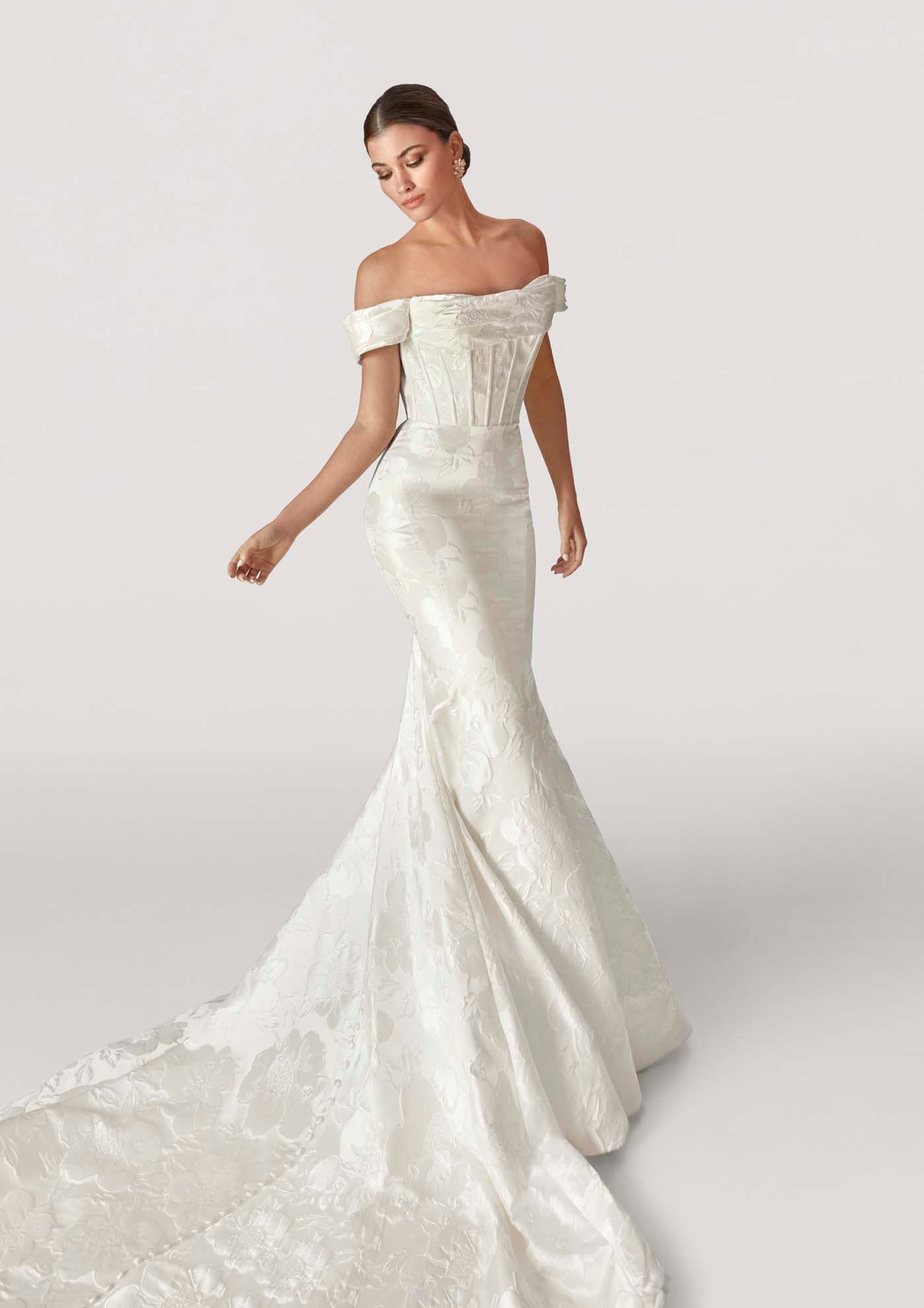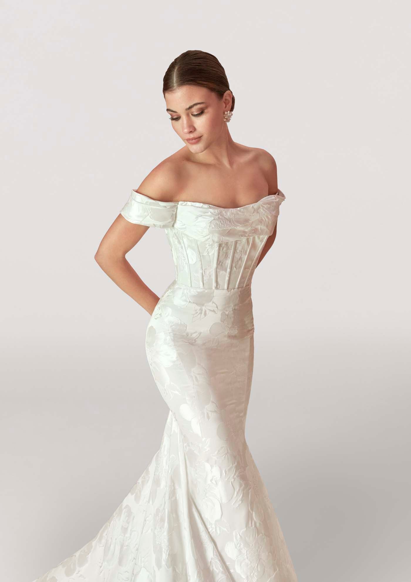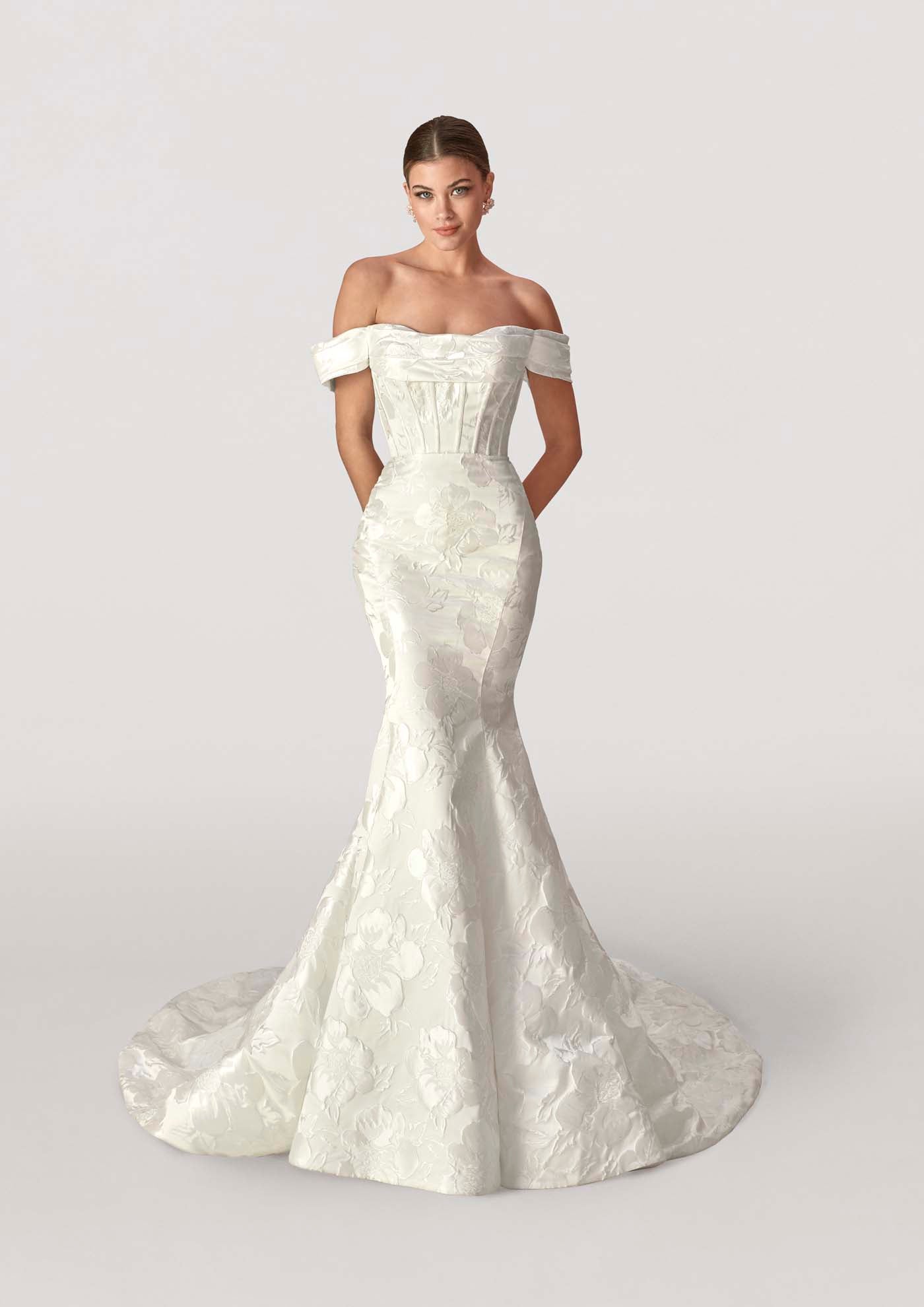 Le jacquard à motifs floraux confère un attrait vintage et intemporel à cette robe ajustée et évasée à épaules dénudées : La Gloria.
