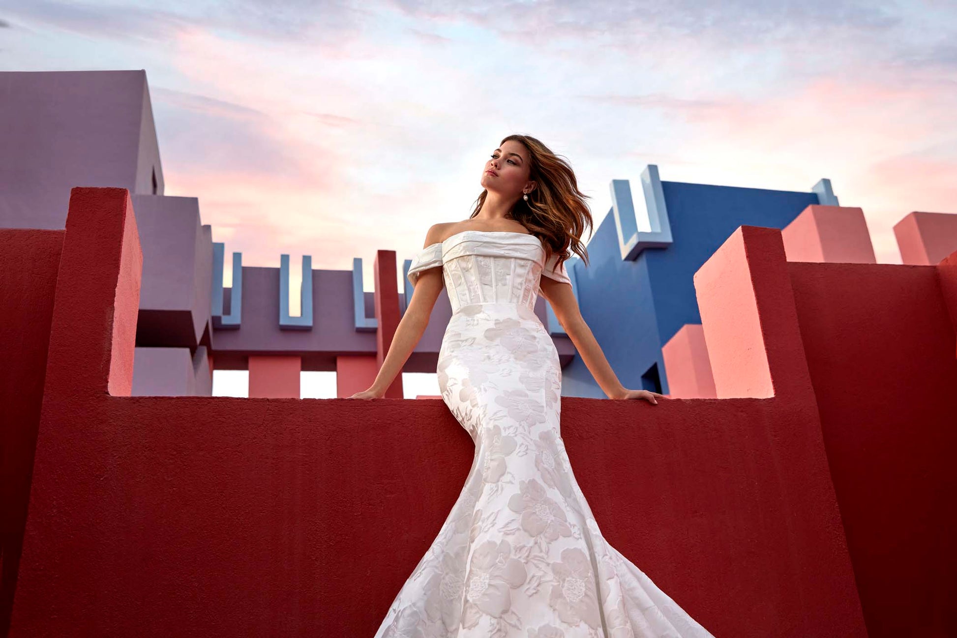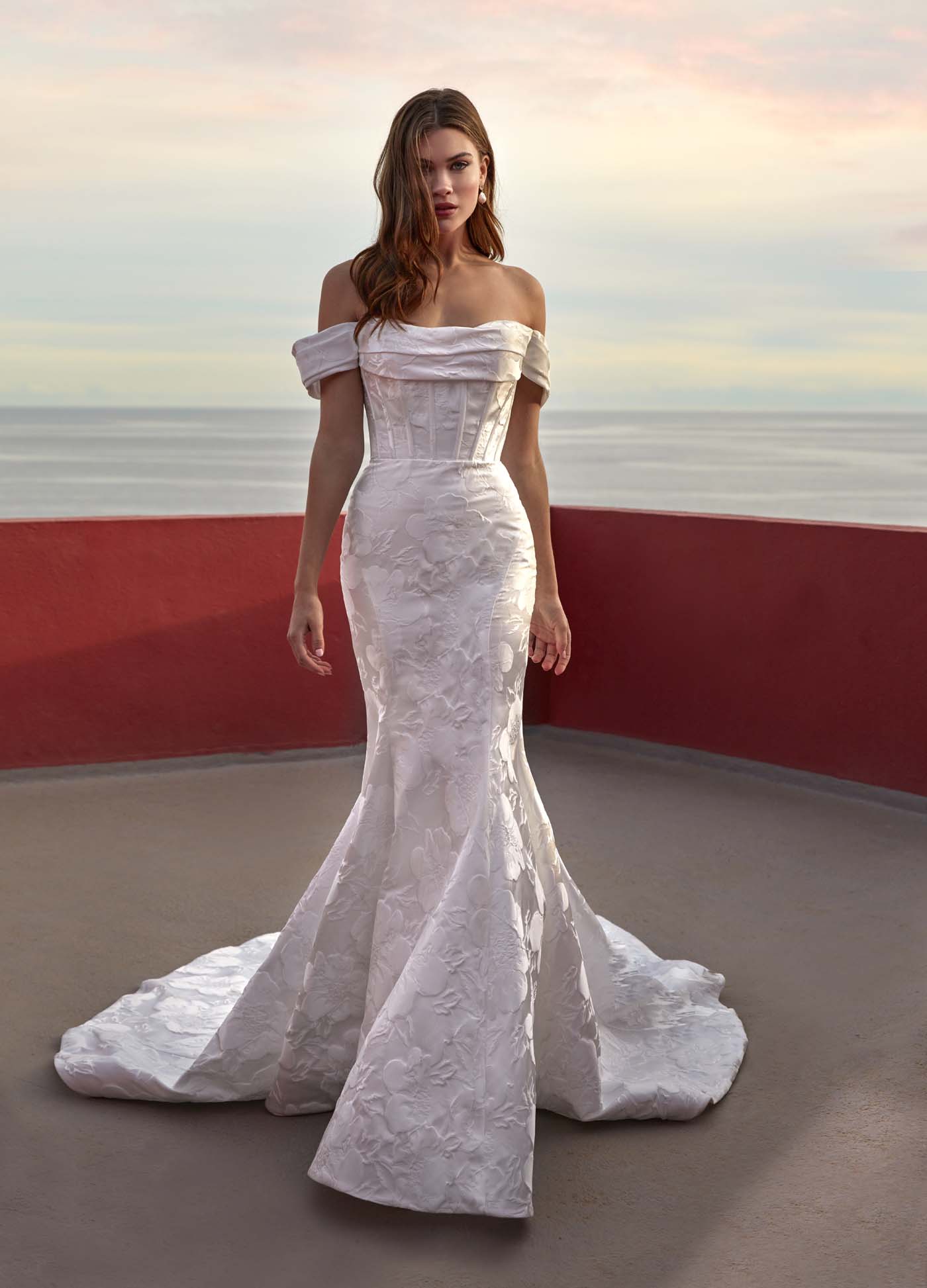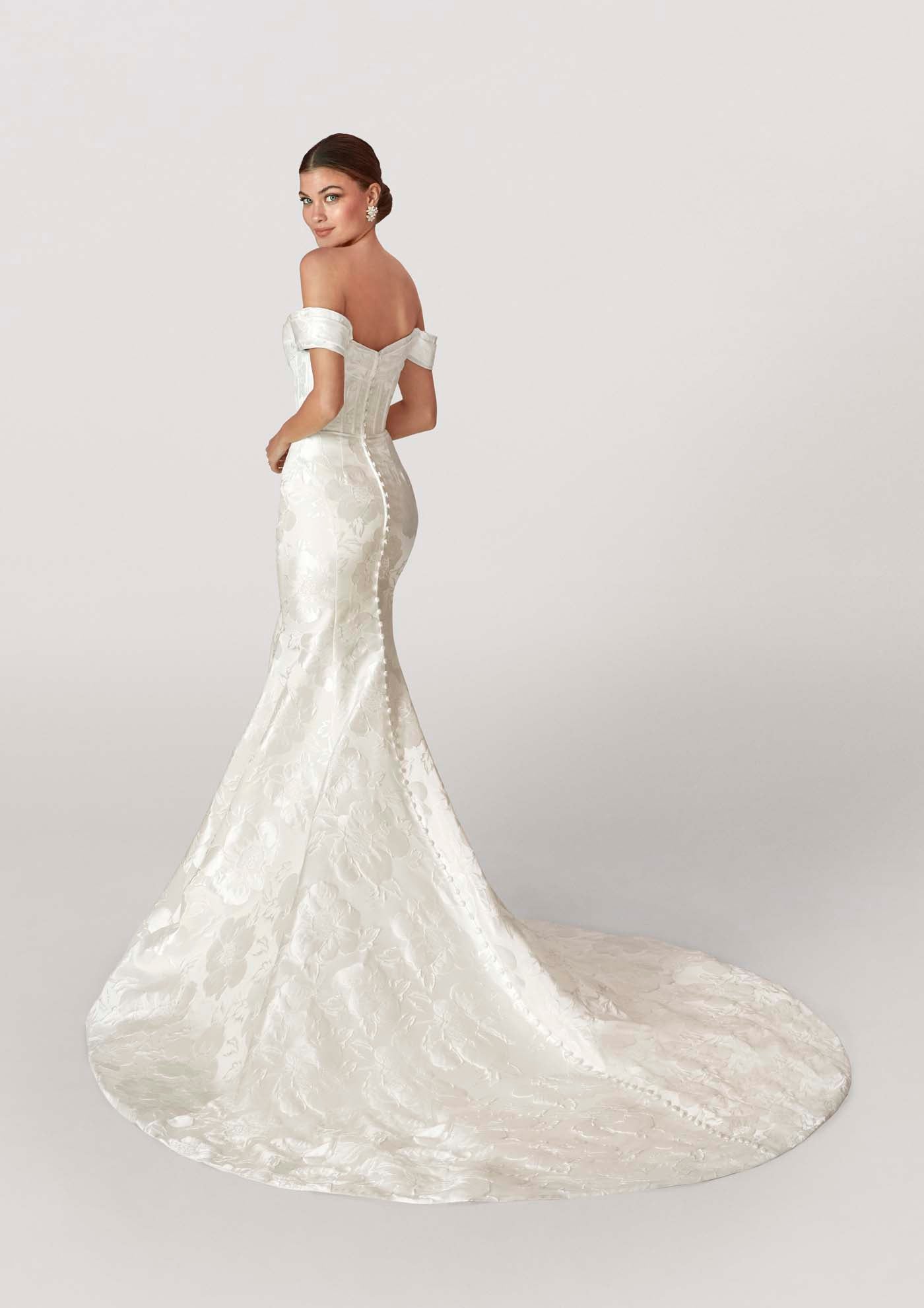Le jacquard à motifs floraux confère un attrait vintage et intemporel à cette robe ajustée et évasée à épaules dénudées : La Gloria.