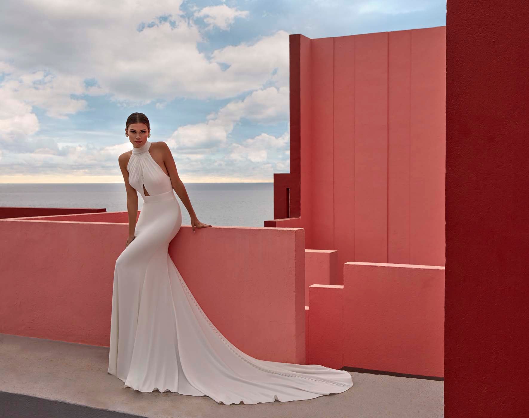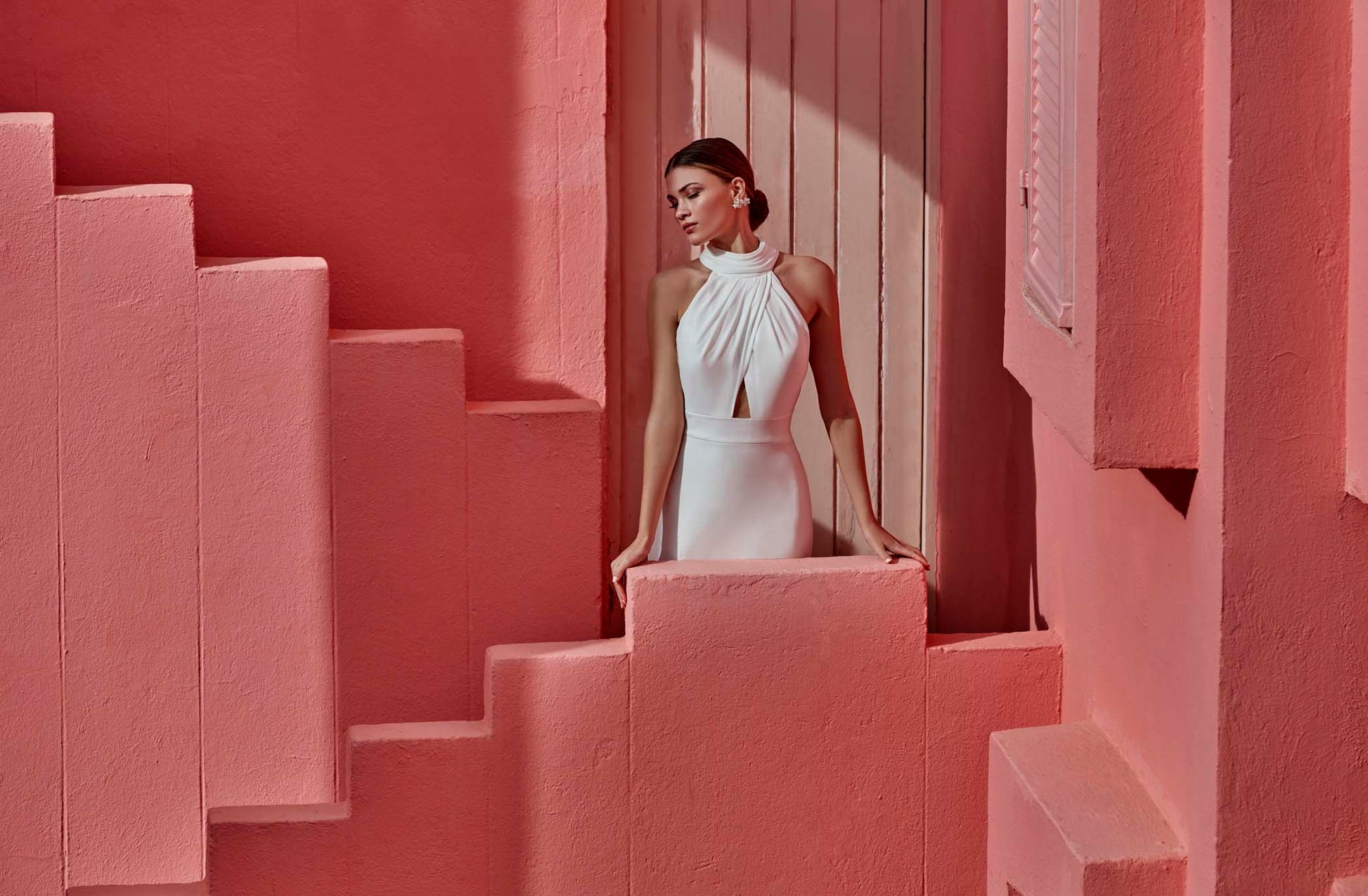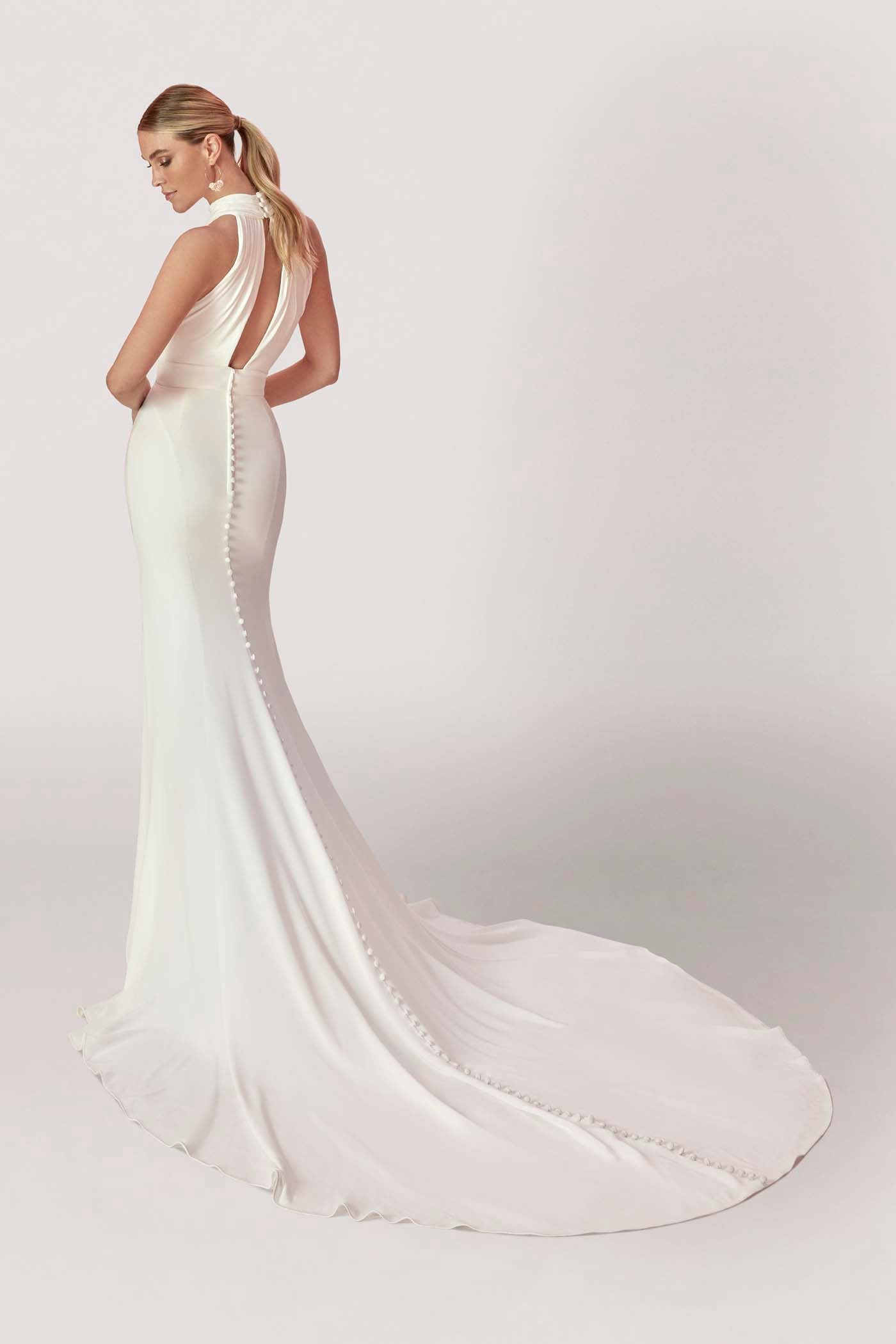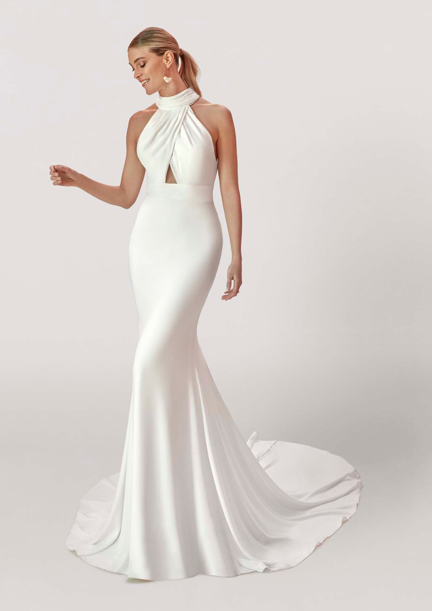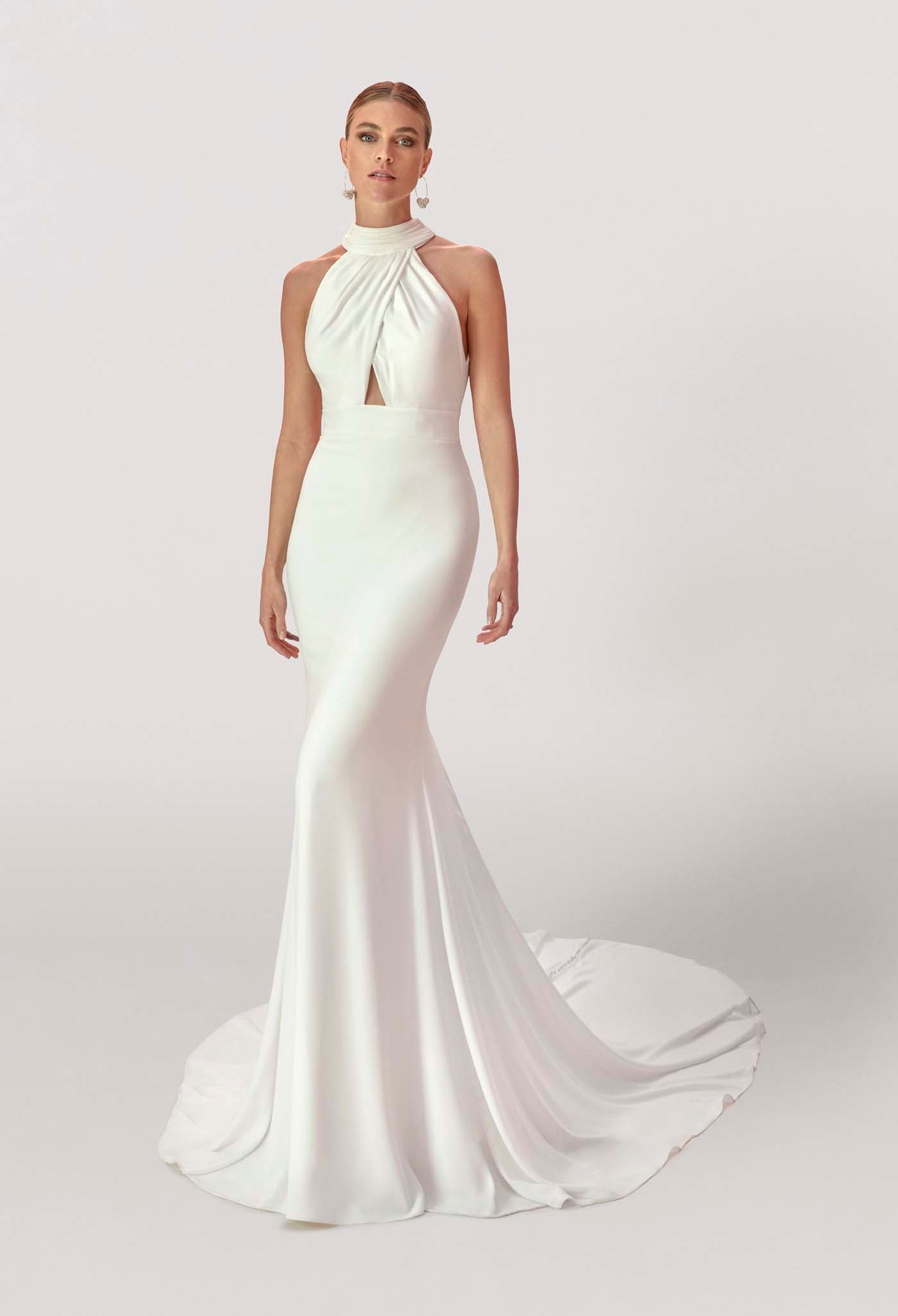 Une silhouette licou froncée inspirée du vieux Hollywood donne à Goldie une touche vintage sur une approche minimaliste du style de mariée.