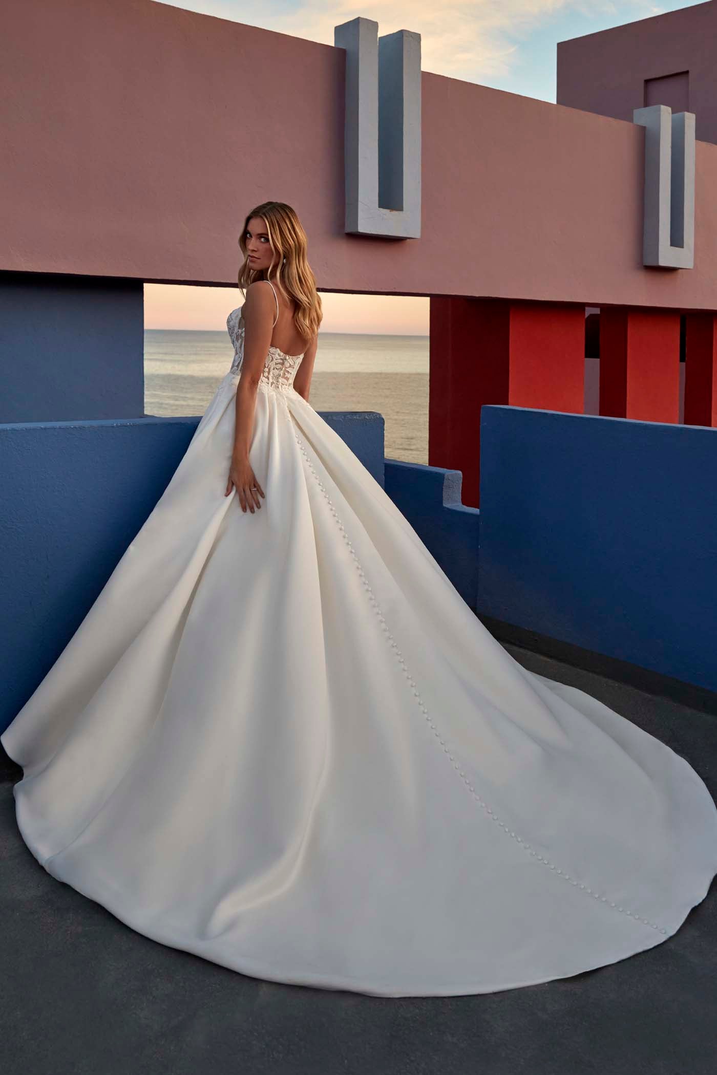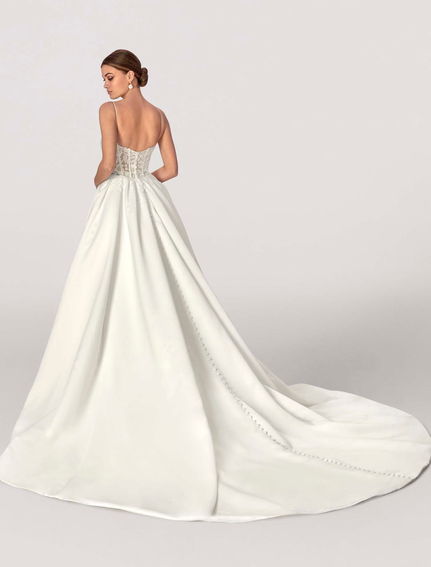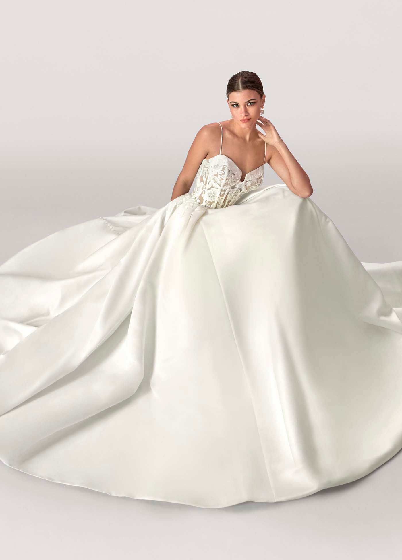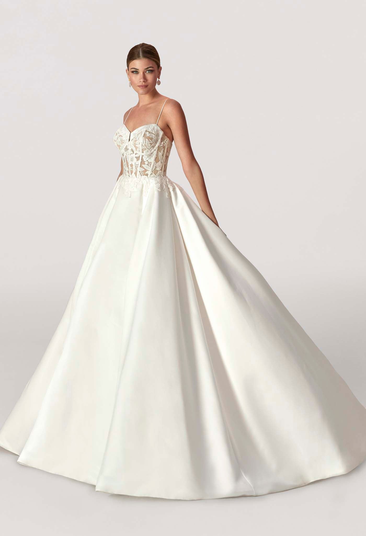 La robe de bal de Genève présente des appliques en dentelle mate le long de son corsage en satin en forme de cœur.