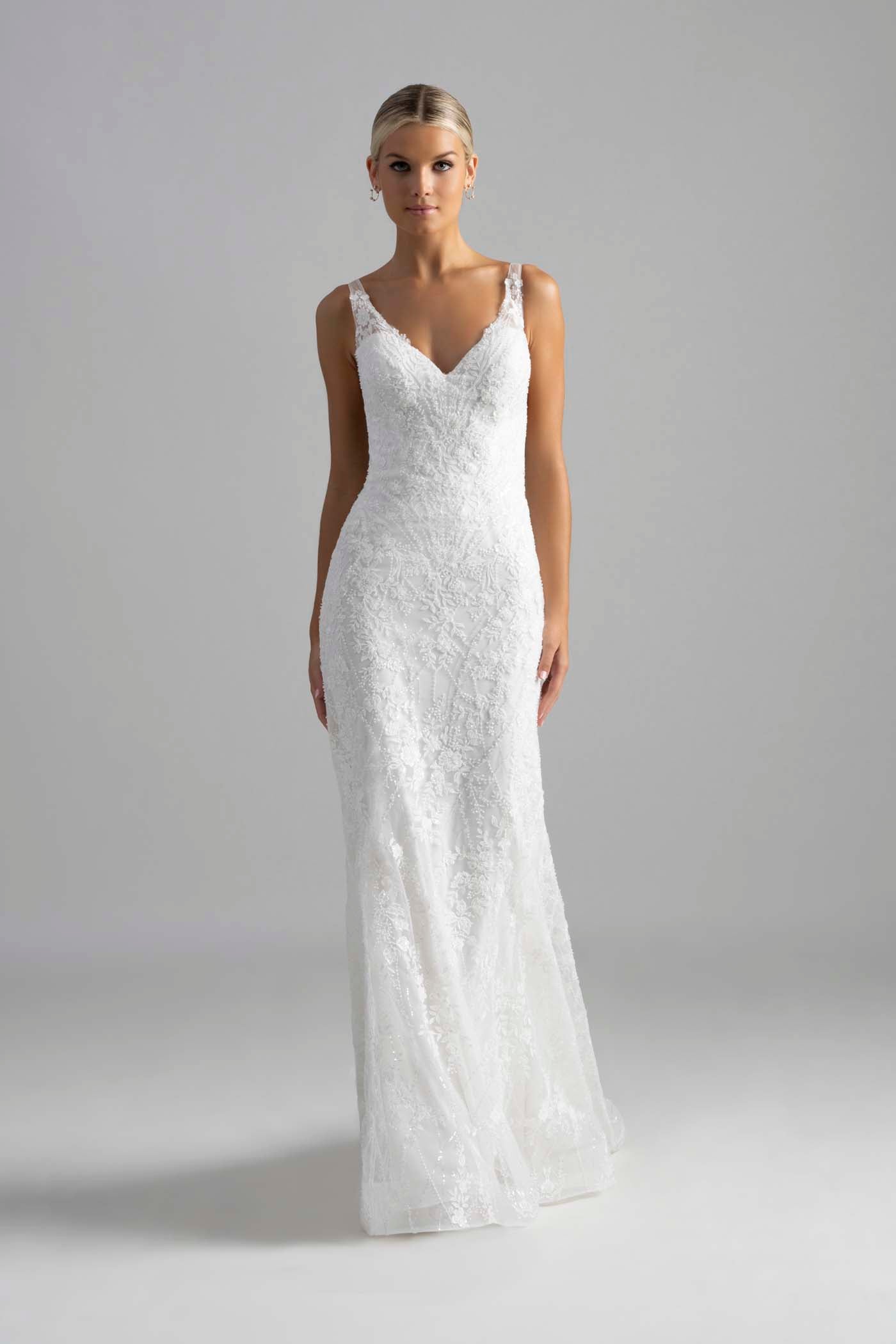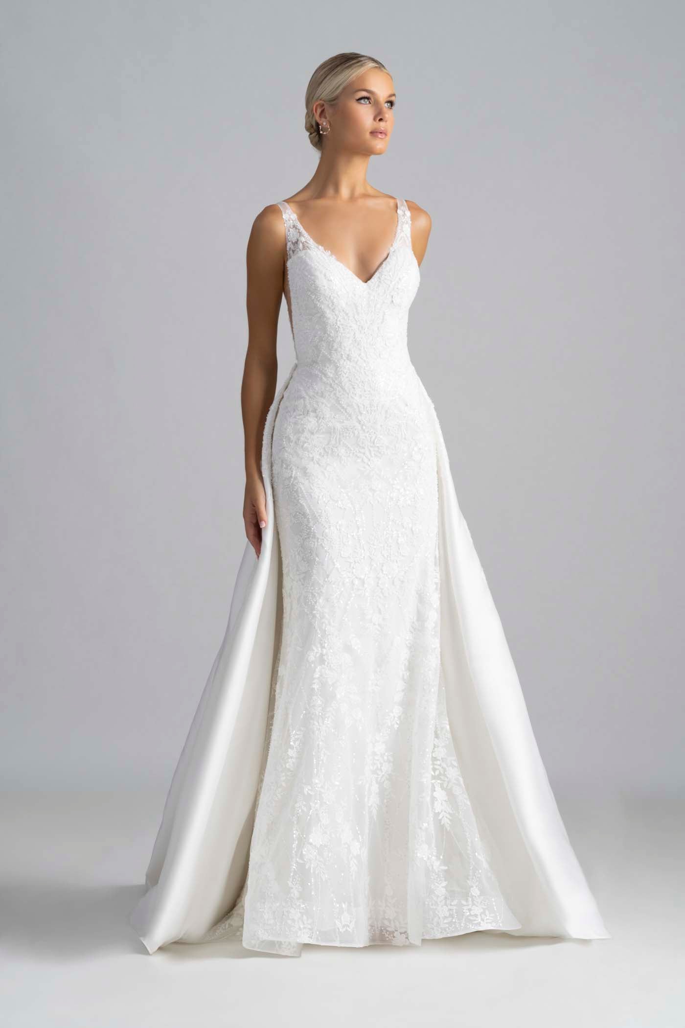 La robe Farris présente des applications de dentelle perlée et pailletée sur sa silhouette fourreau sans manches et est ornée d'une traîne amovible en mikado. La traîne est vendue séparément sous la référence MJ1114T.