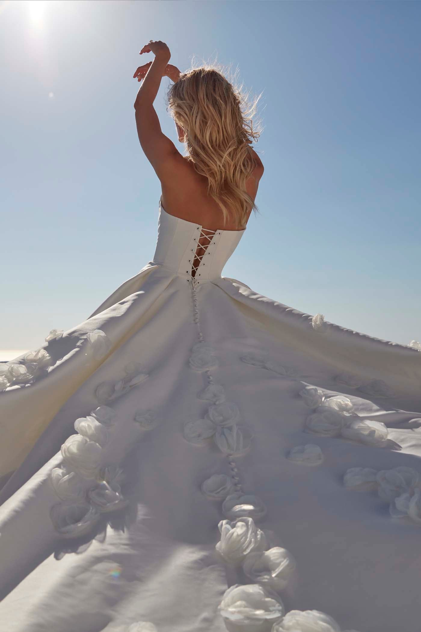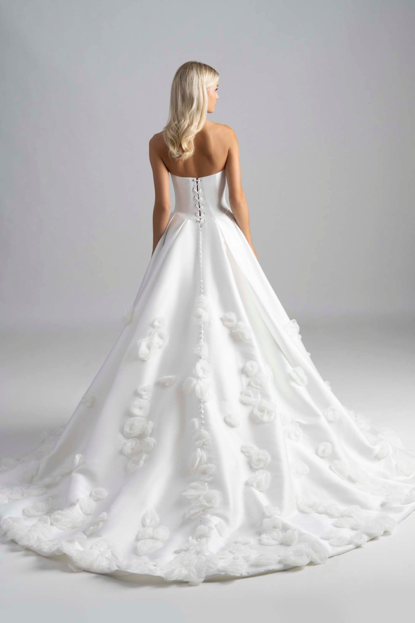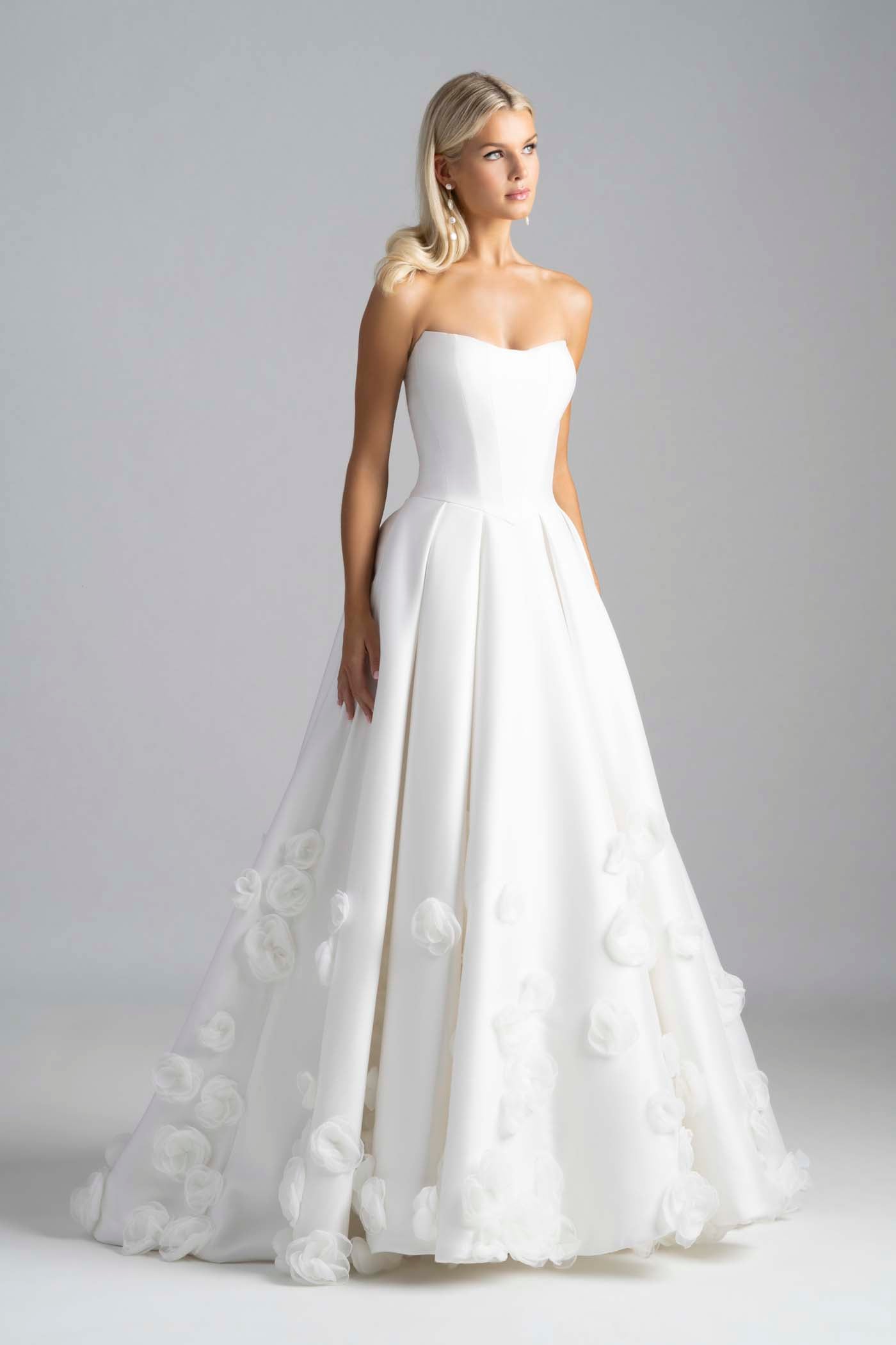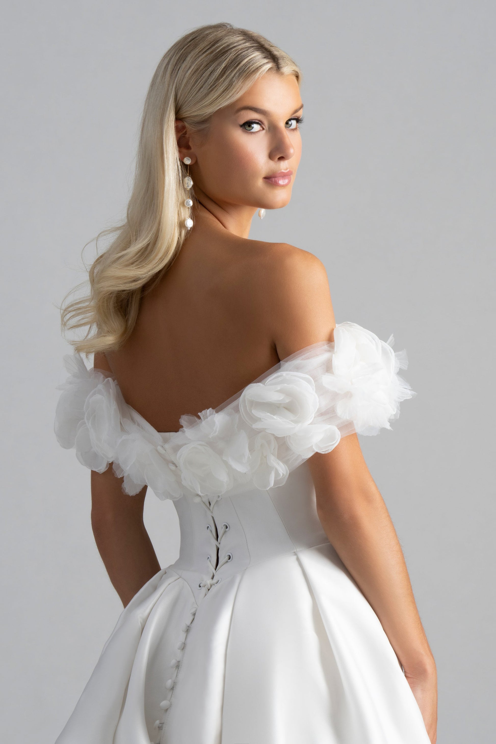 Des rosaces appliquées en relief parcourent la jupe ample de la robe de bal de Fenella ; cette robe de mariée en mikado est également rehaussée d'un décolleté épaules dénudées d'inspiration florale. Veste modèle J53 vendue séparément.