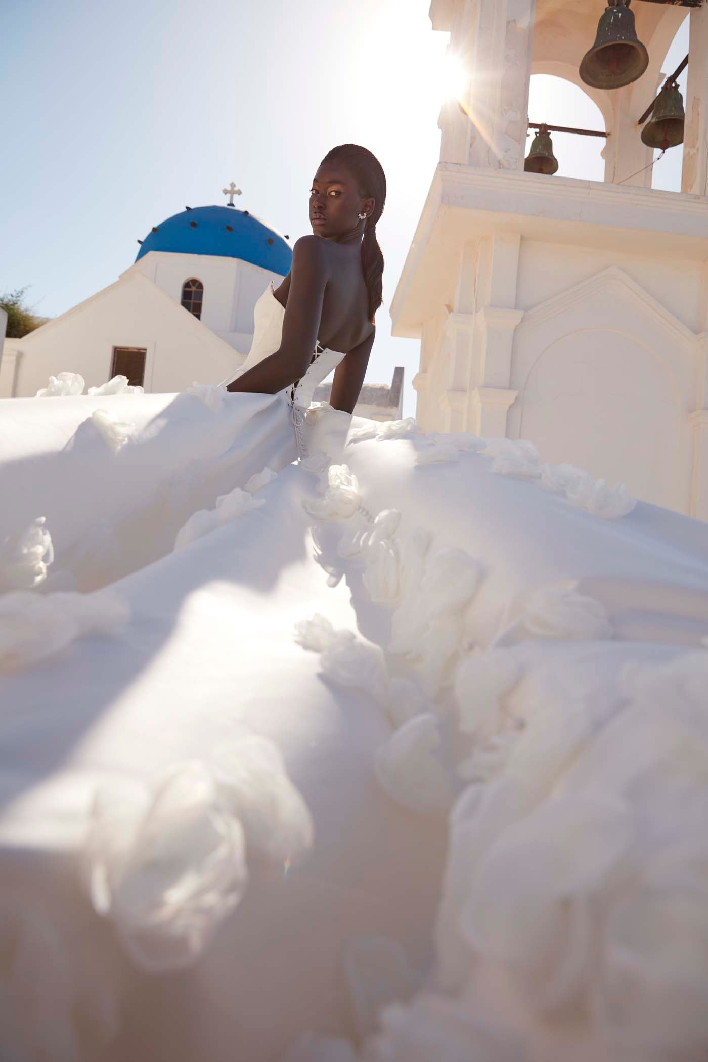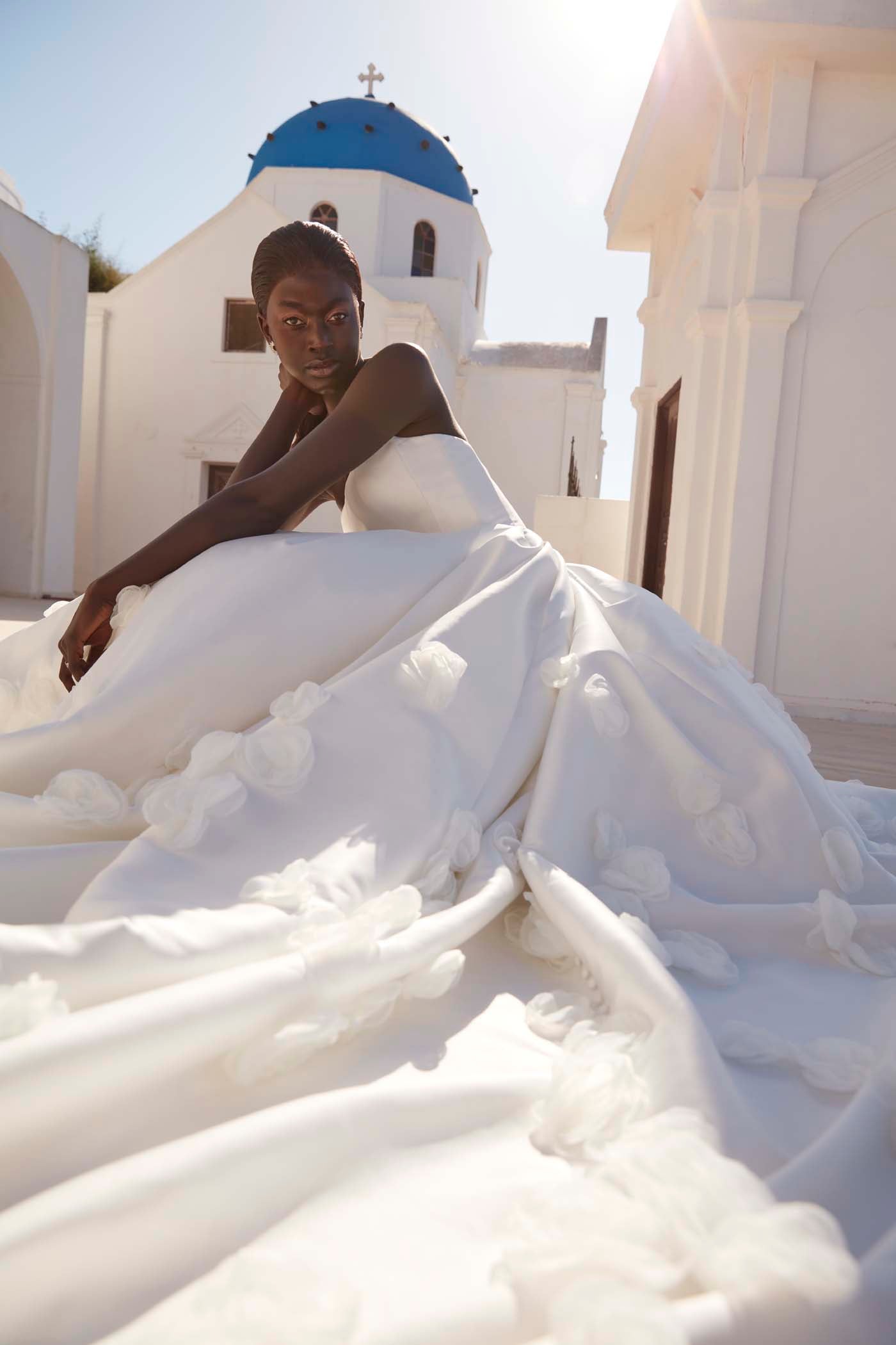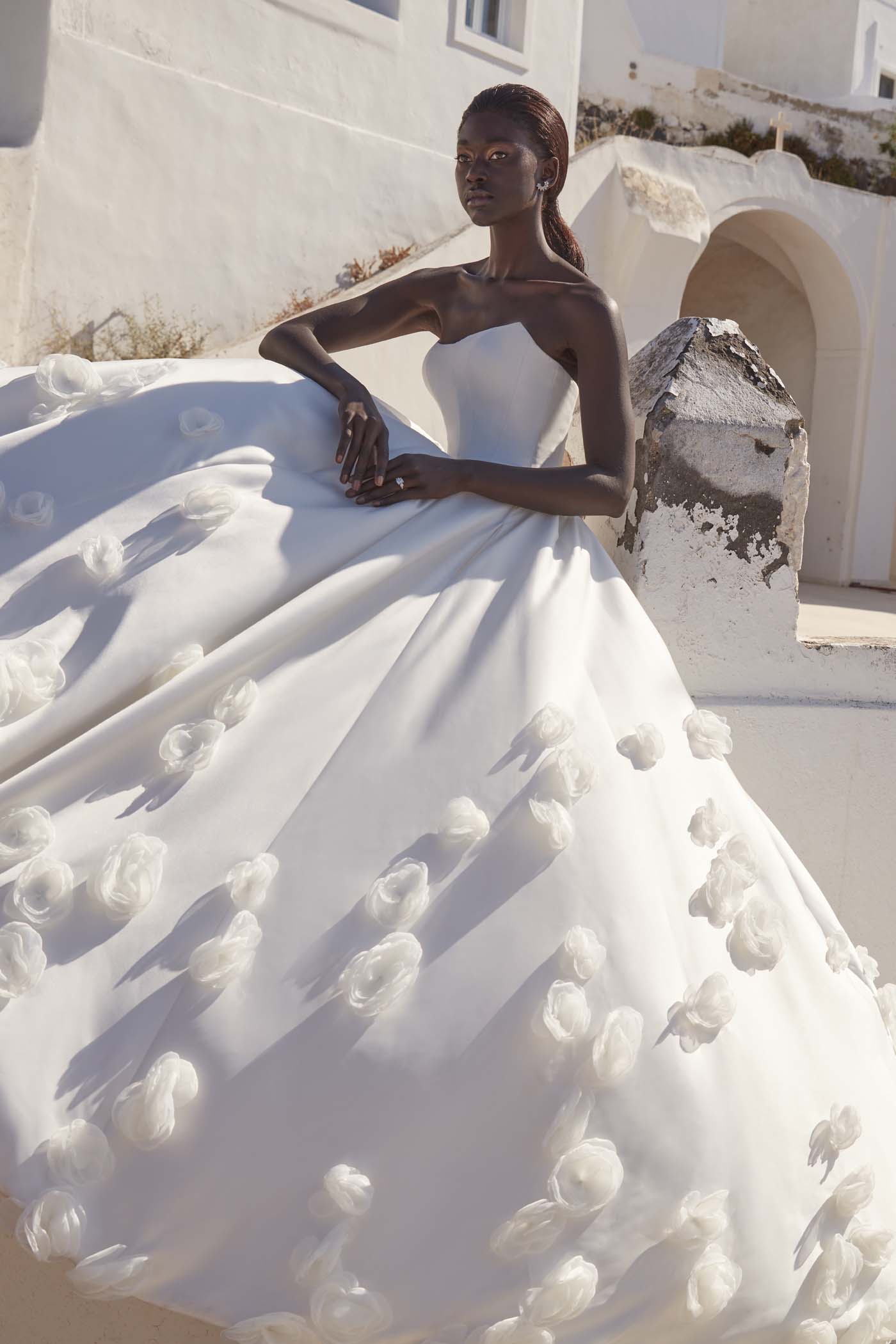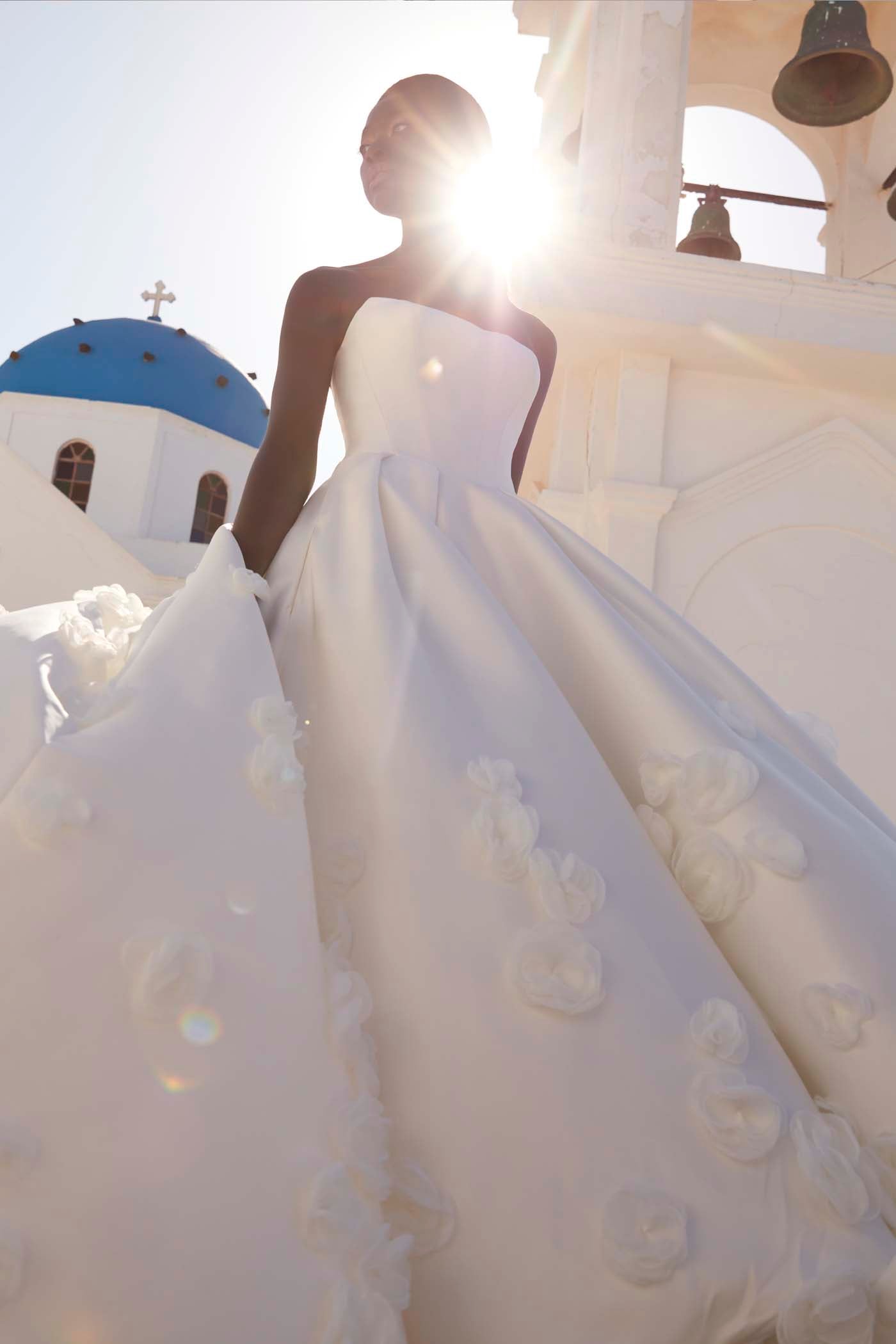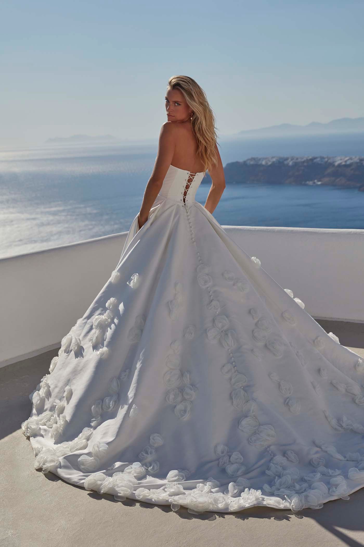 Des rosaces appliquées en relief parcourent la jupe ample de la robe de bal de Fenella ; cette robe de mariée en mikado est également rehaussée d'un décolleté épaules dénudées d'inspiration florale. Veste modèle J53 vendue séparément.