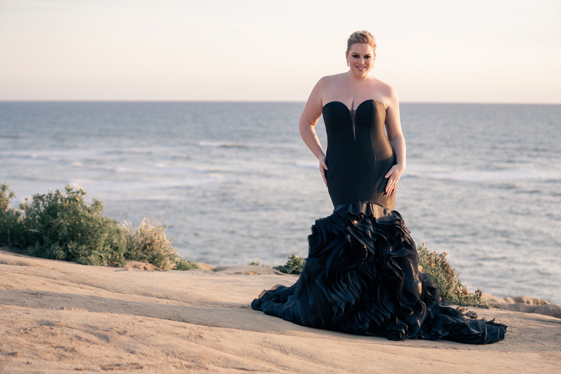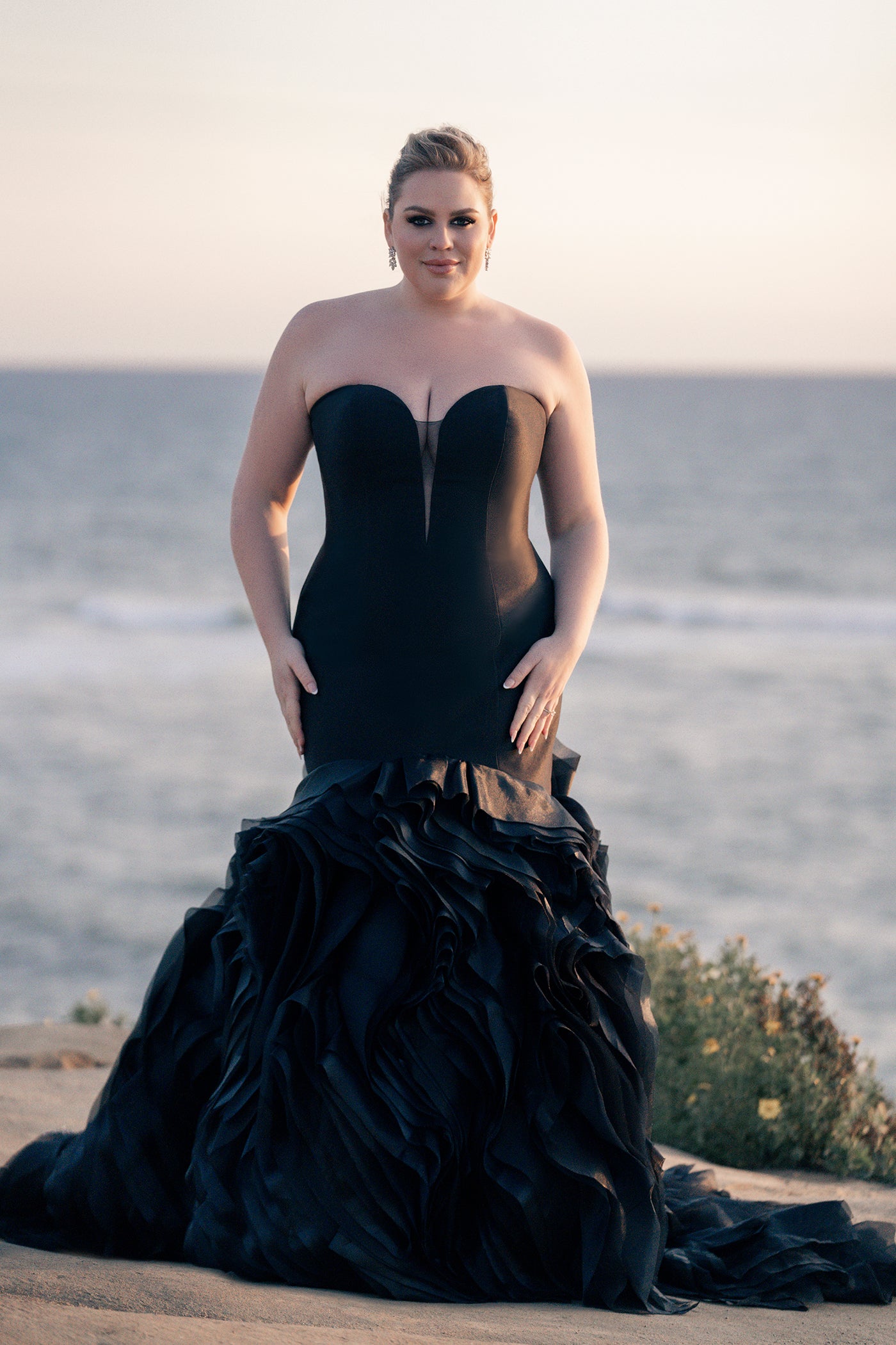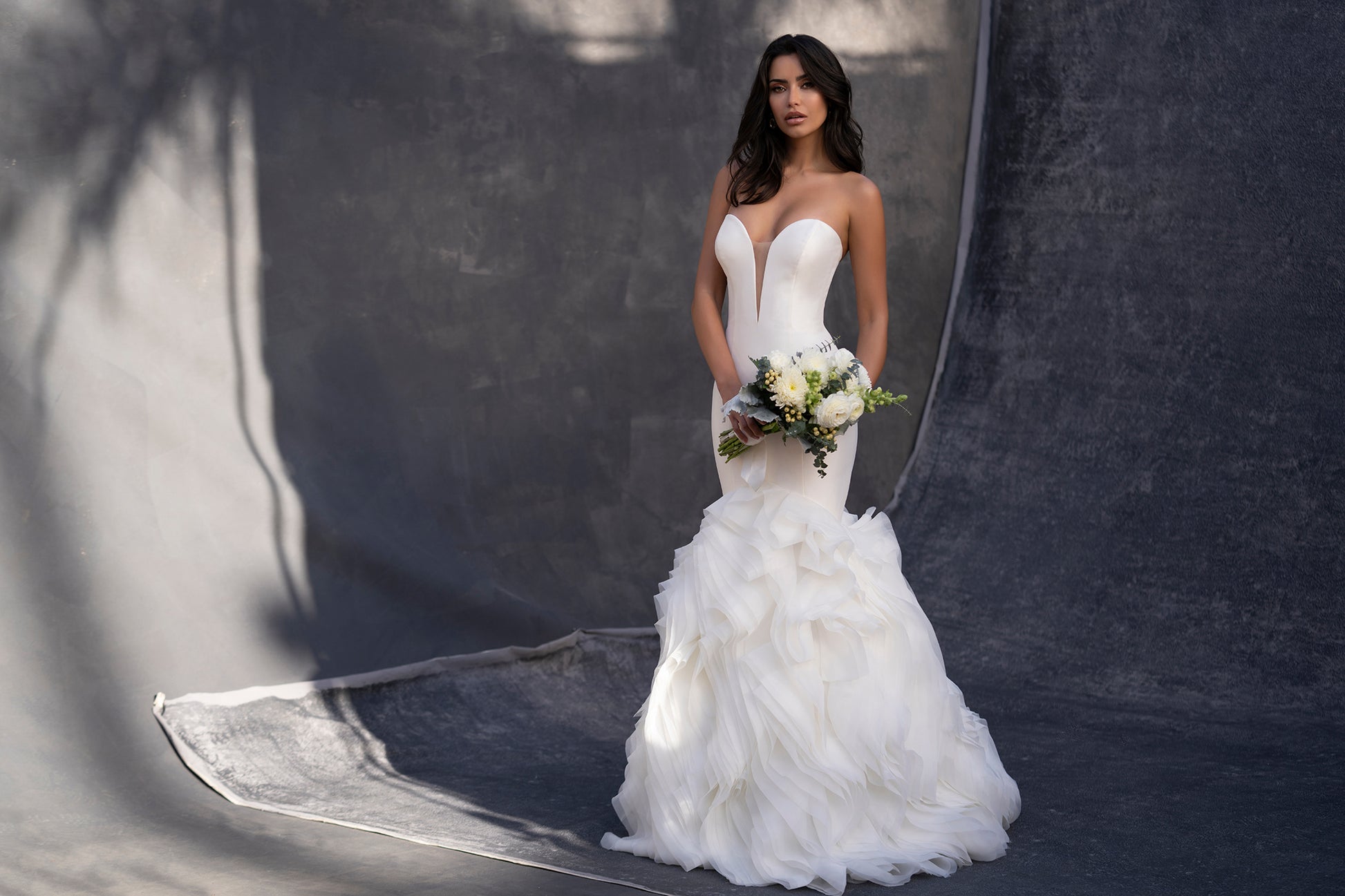 L'organza coupé au rasoir semblable à de la meringue crée l'illusion de vagues de l'océan le long du corsage de cette robe sirène en mikado sans bretelles.