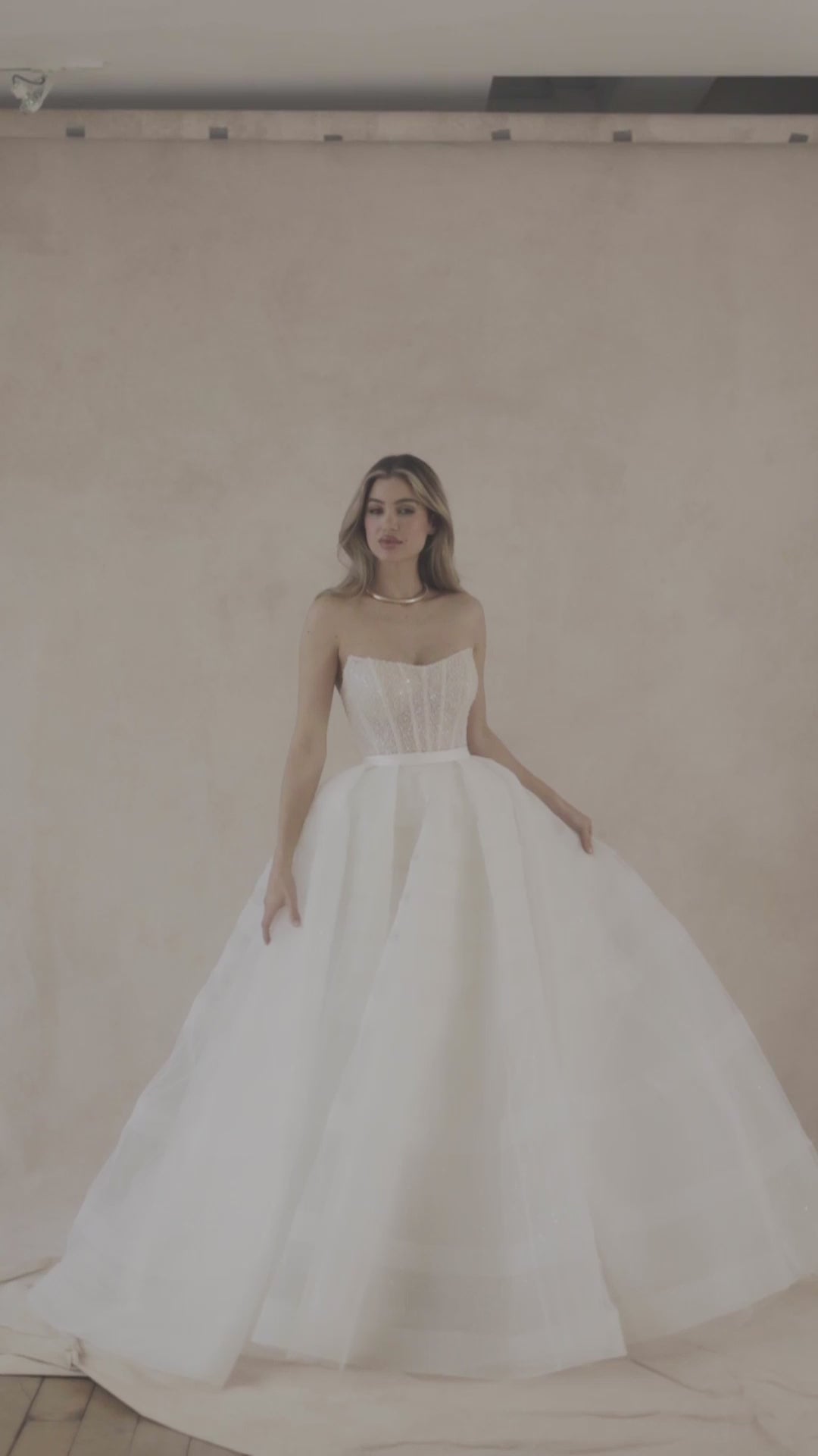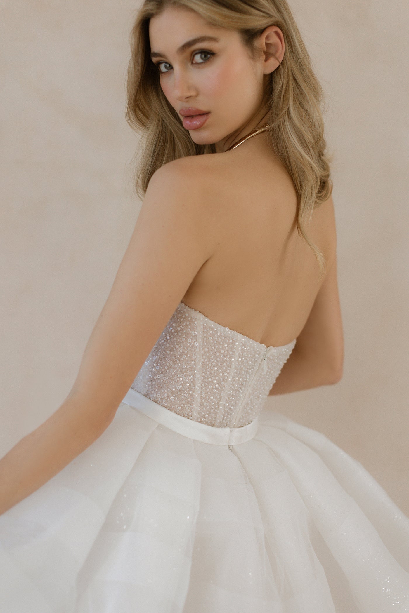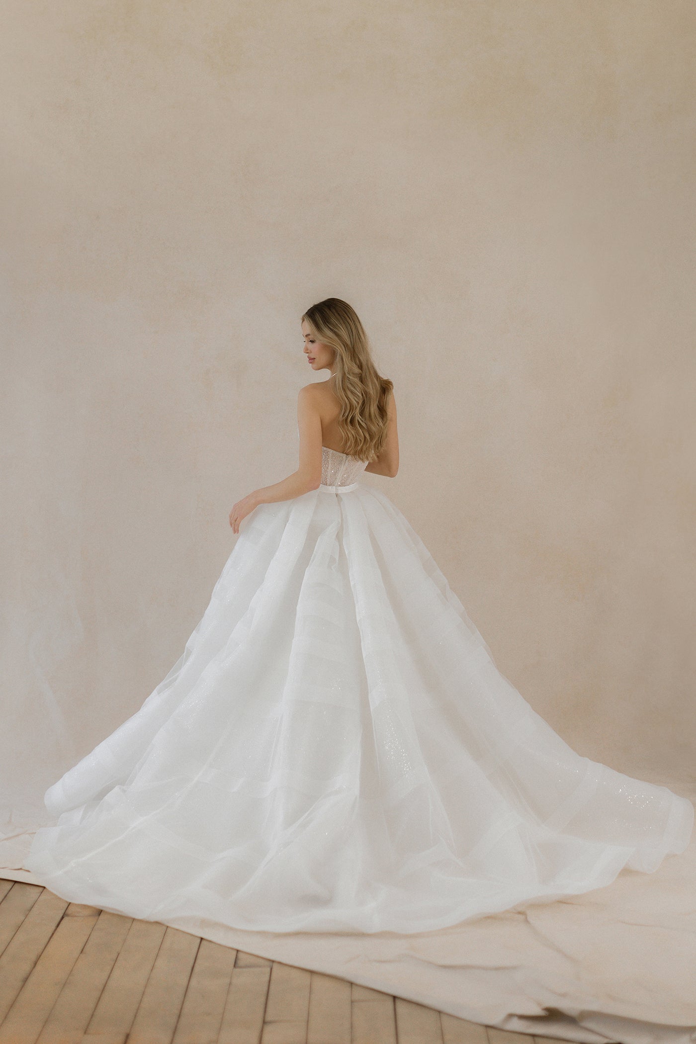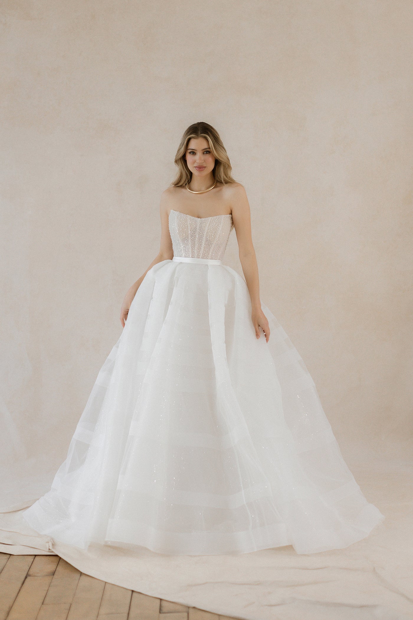 Audacieuse et texturée, cette jupe amovible associe crin de cheval rayé et tulle pailleté pour une touche de modernité et de raffinement. La ceinture en satin apporte une touche finale élégante à la tenue, en faisant une pièce maîtresse pour les mariées avant-gardistes.