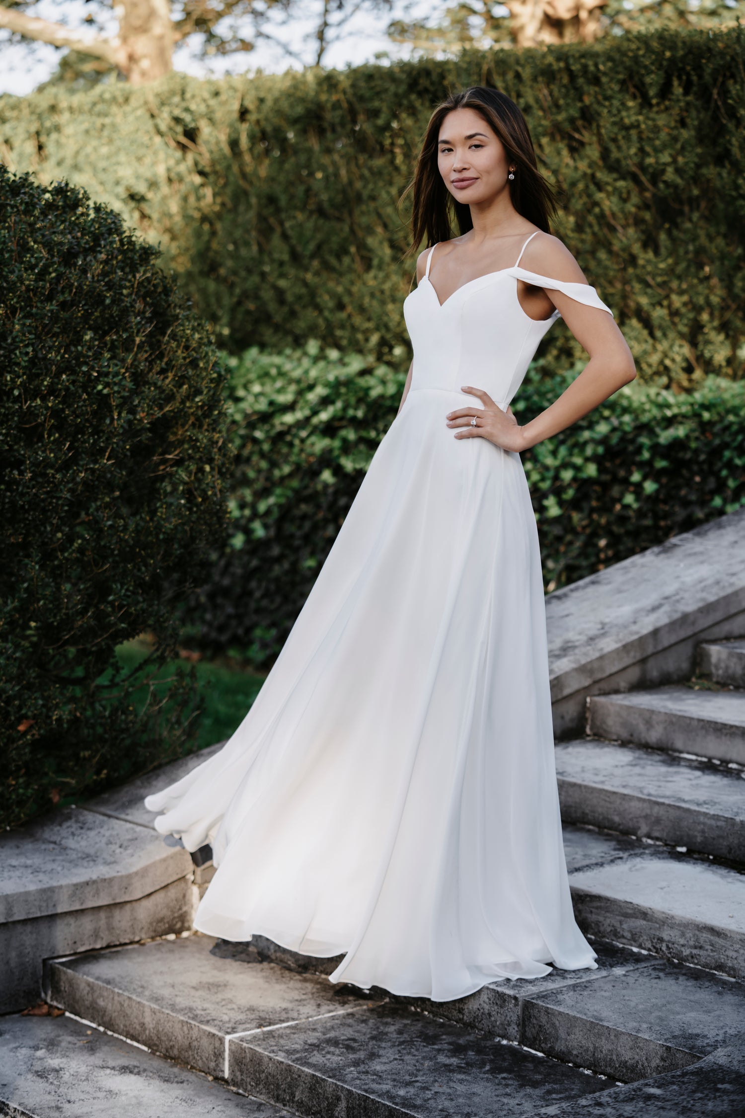 Une délicate manche flottante aux épaules dénudées apporte une touche de romantisme à cette robe de demoiselle d'honneur en mousseline. Le décolleté en cœur et la taille naturelle se fondent dans une élégante jupe trapèze longue, créant une silhouette flatteuse d'une simplicité intempo... Read More