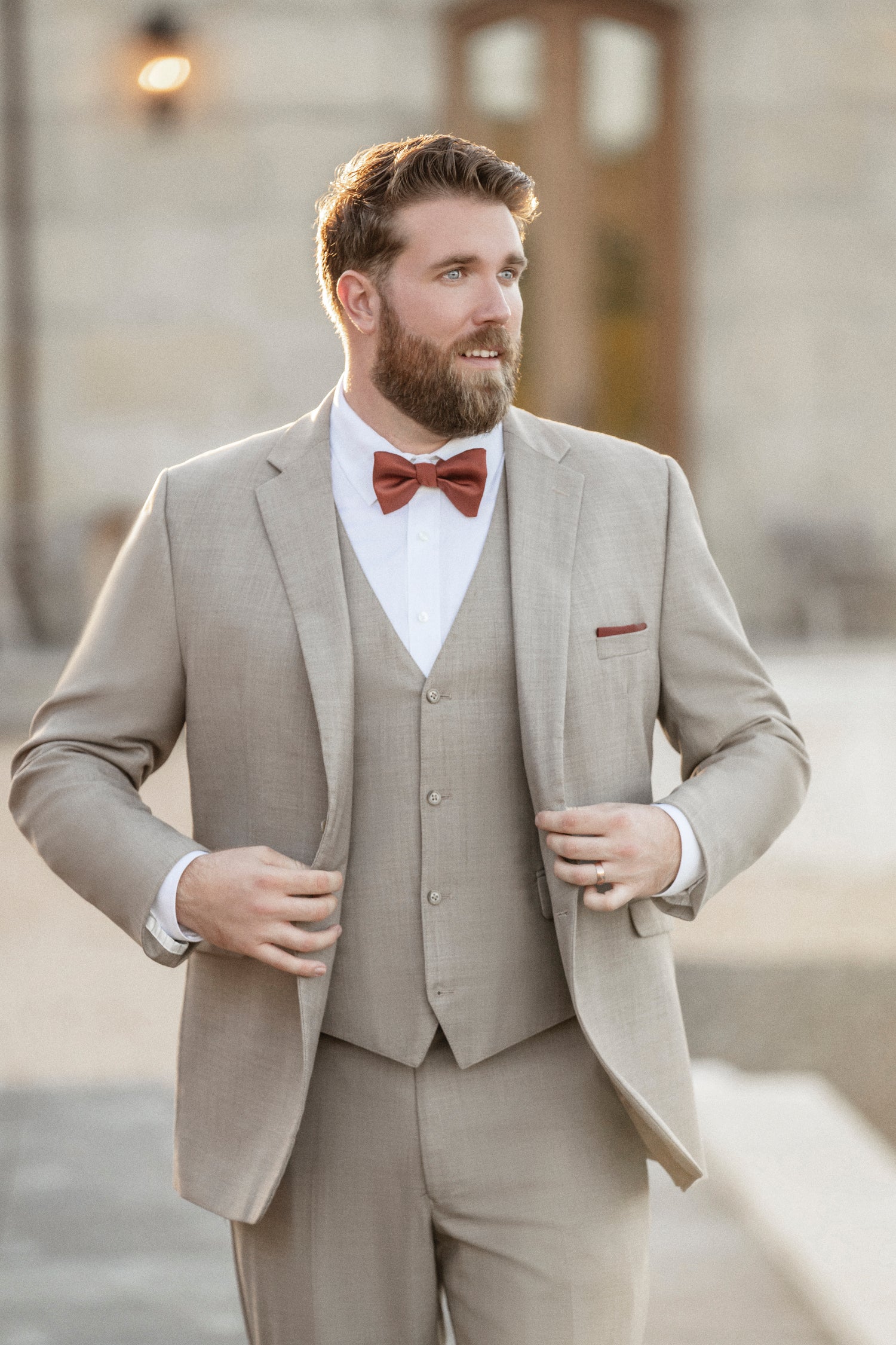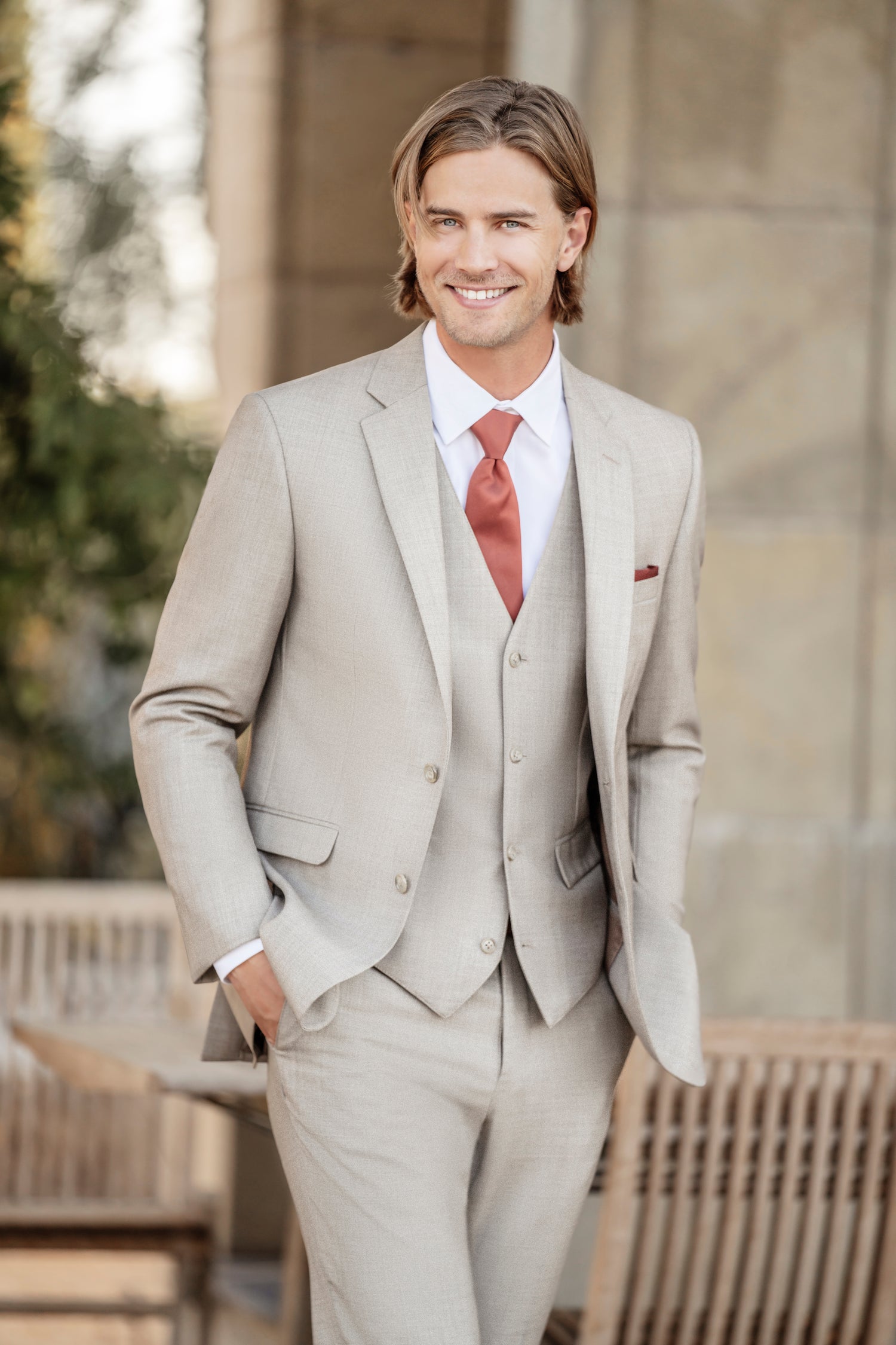 Nous nous sommes associés à Generation Tux pour créer un costume tissé respirant et texturé. Doté d'un tissu respirant Coolmax® évacuant l'humidité et d'une construction en fibre extensible Sorona® pour un confort accru, notre costume Allure Beige est le choix idéal et le plus confortable pour votre prochain mariage ou événement estival. Read Less