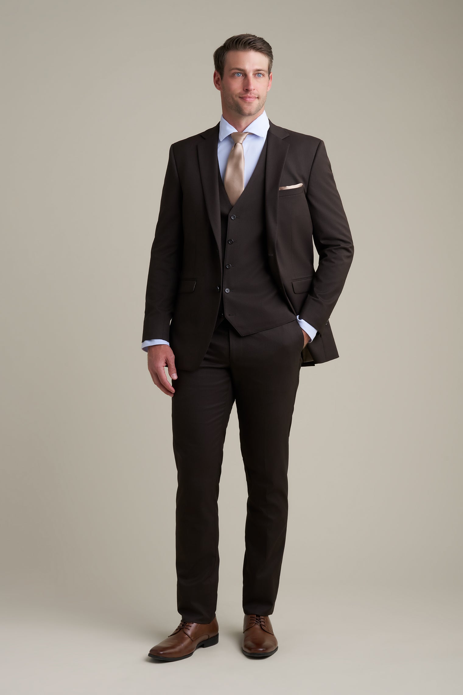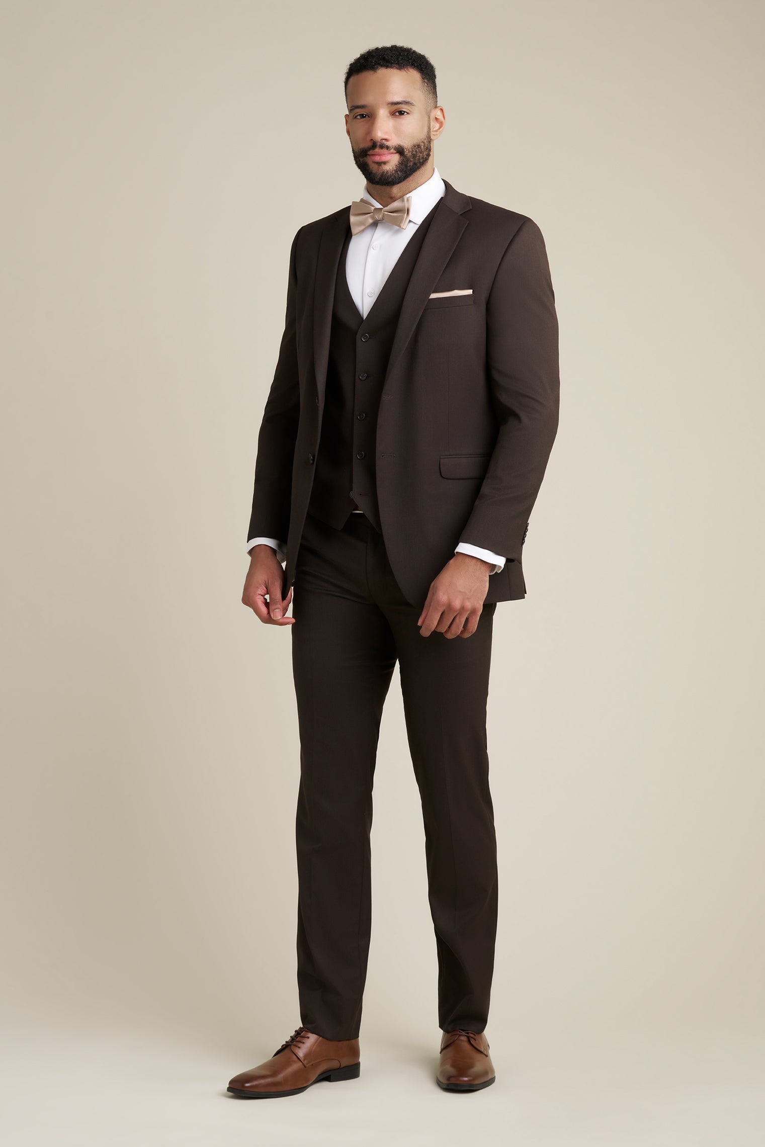 Le costume marron à revers crantés est d'un élégant brun foncé, offrant une allure formelle et s'accordant facilement avec des cravates et pochettes colorées. Ce costume est idéal pour les mariages, que vous soyez le marié, le témoin ou un invité. Il est également parfait pour les occasions formelles comme les bals de fin d'année, les événements professionnels ou les galas de charité, grâce à sa couleur et son design intemporels qui le rendent polyvalent en toute occasion. Vous pouvez essayer ce costume marron à revers crantés chez l'un de nos revendeurs de costumes et smokings. Également disponible en tailles Big and Tall ou Youth. Read Less