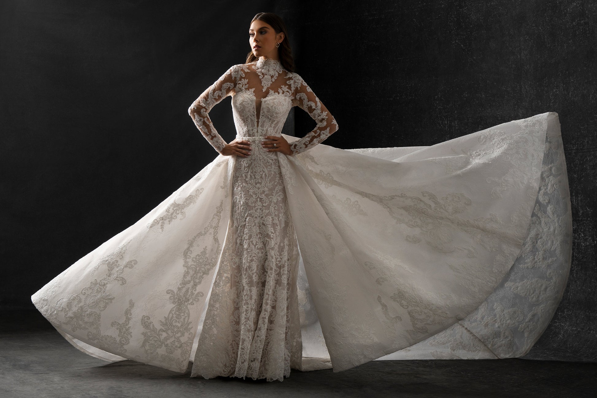 Manches en dentelle d'Alençon et encolure haute, conçues avec le style C768 à l'esprit.
