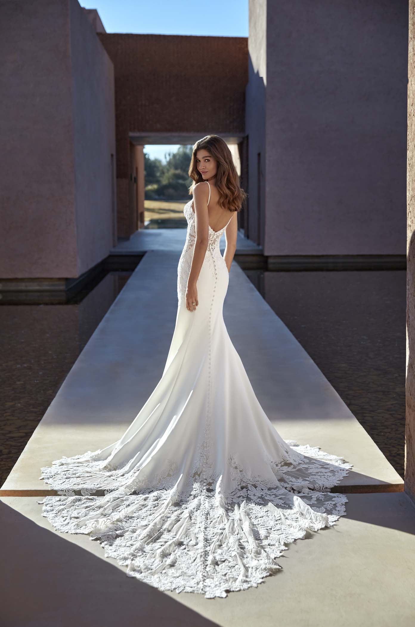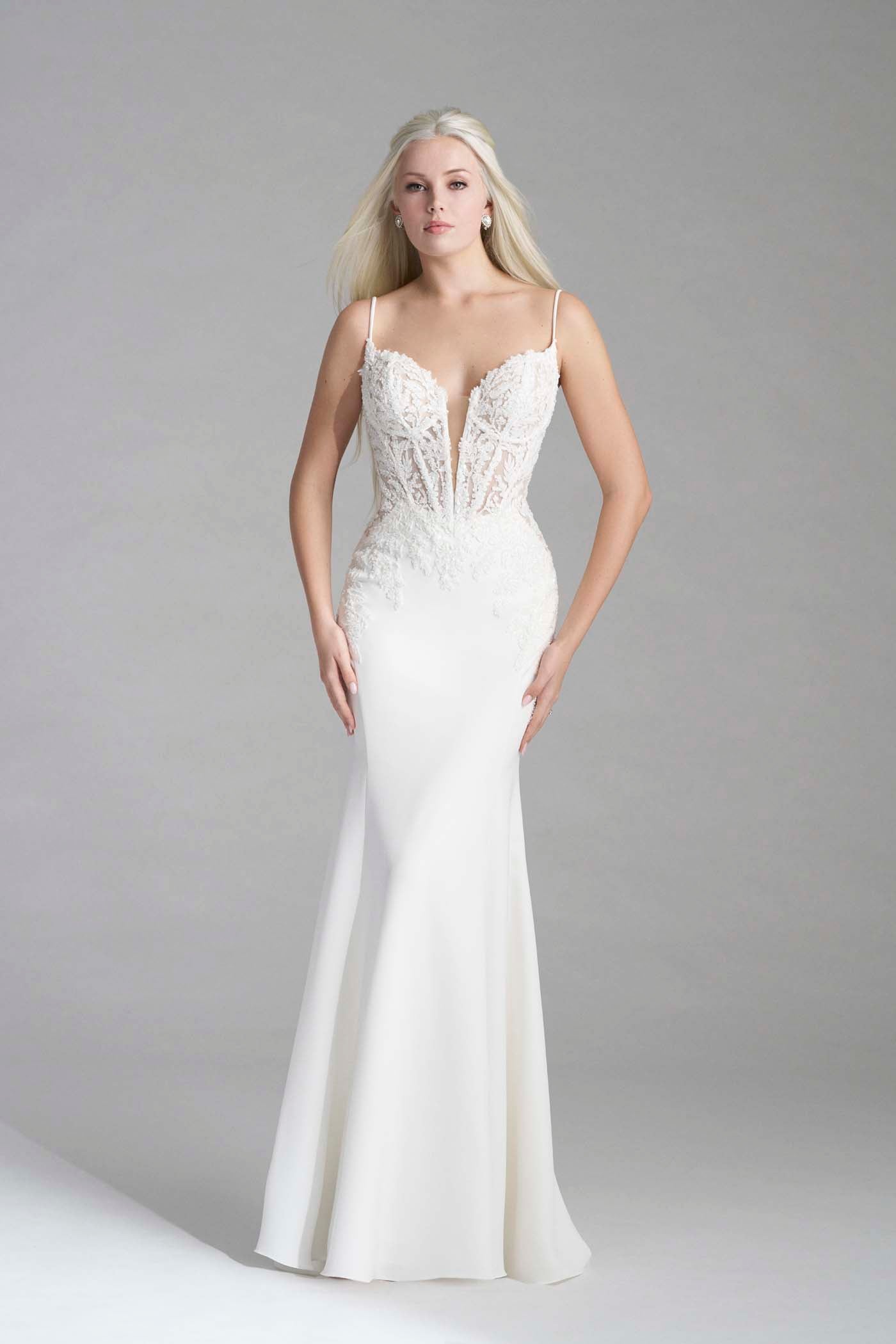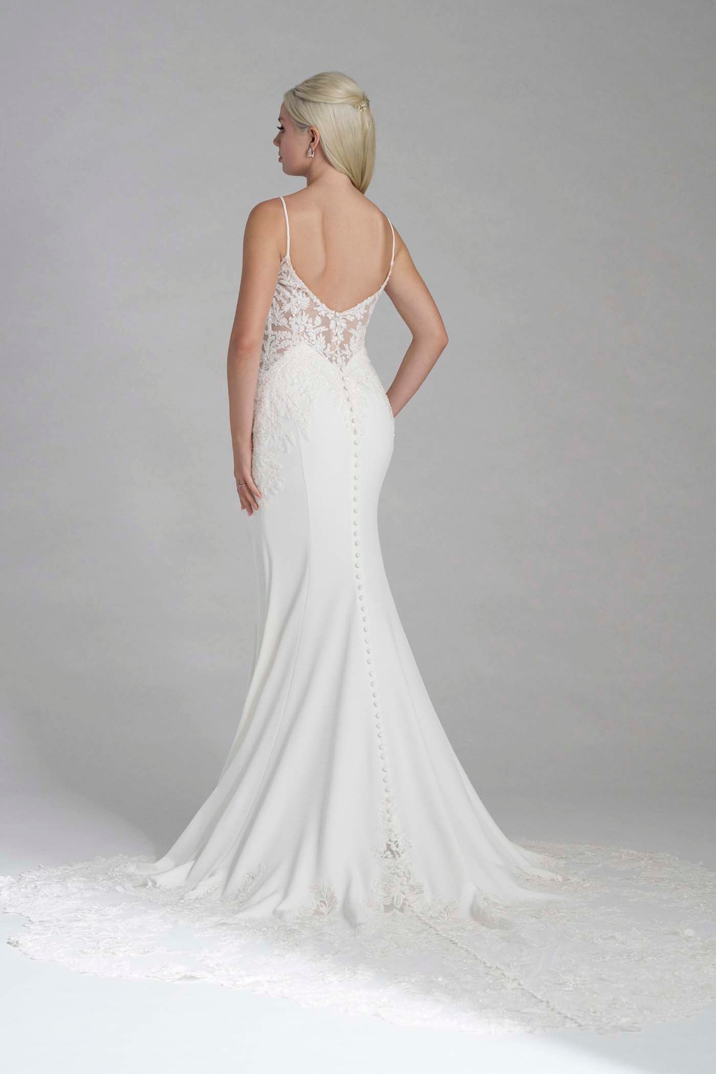 Notre audacieuse robe Elliotte présente un décolleté plongeant en cœur et un corsage transparent à baleines apparentes, créant un contraste saisissant sous des applications de sequins et de dentelle perlée. De délicates bretelles spaghetti rehaussent la silhouette, tandis que la silhouette ajustée en crêpe se prolonge par une traîne chapelle spectaculaire. Read Less