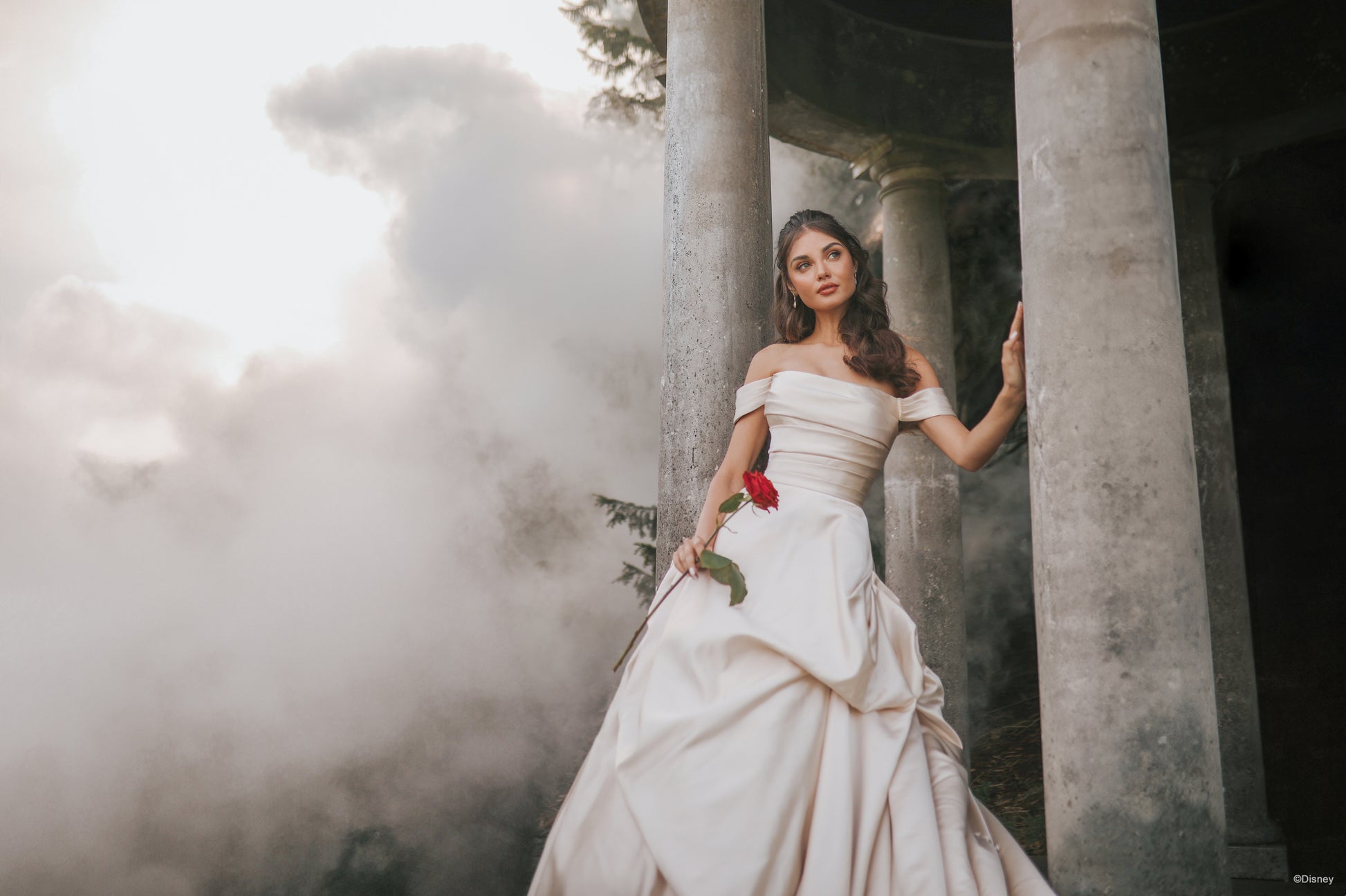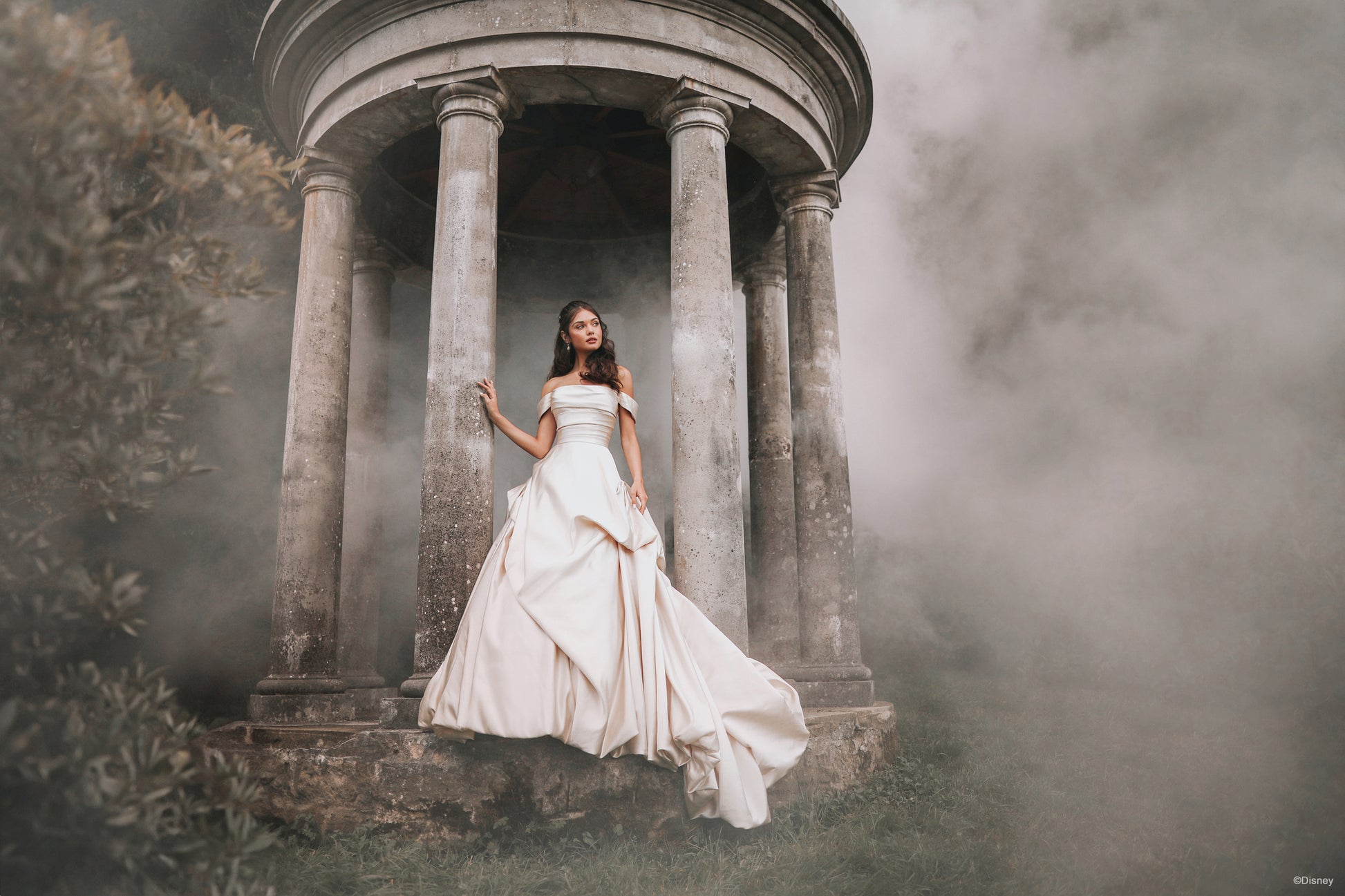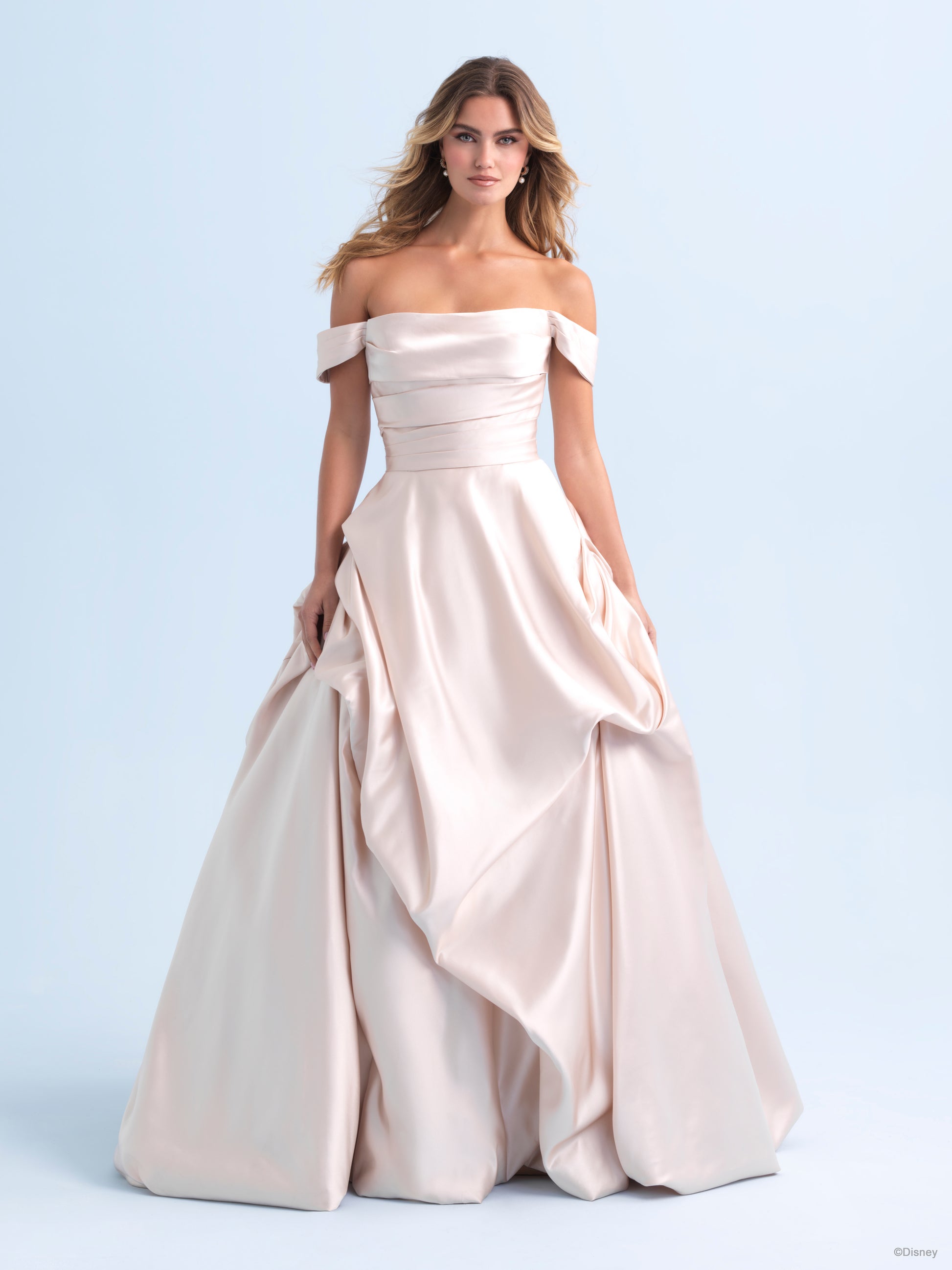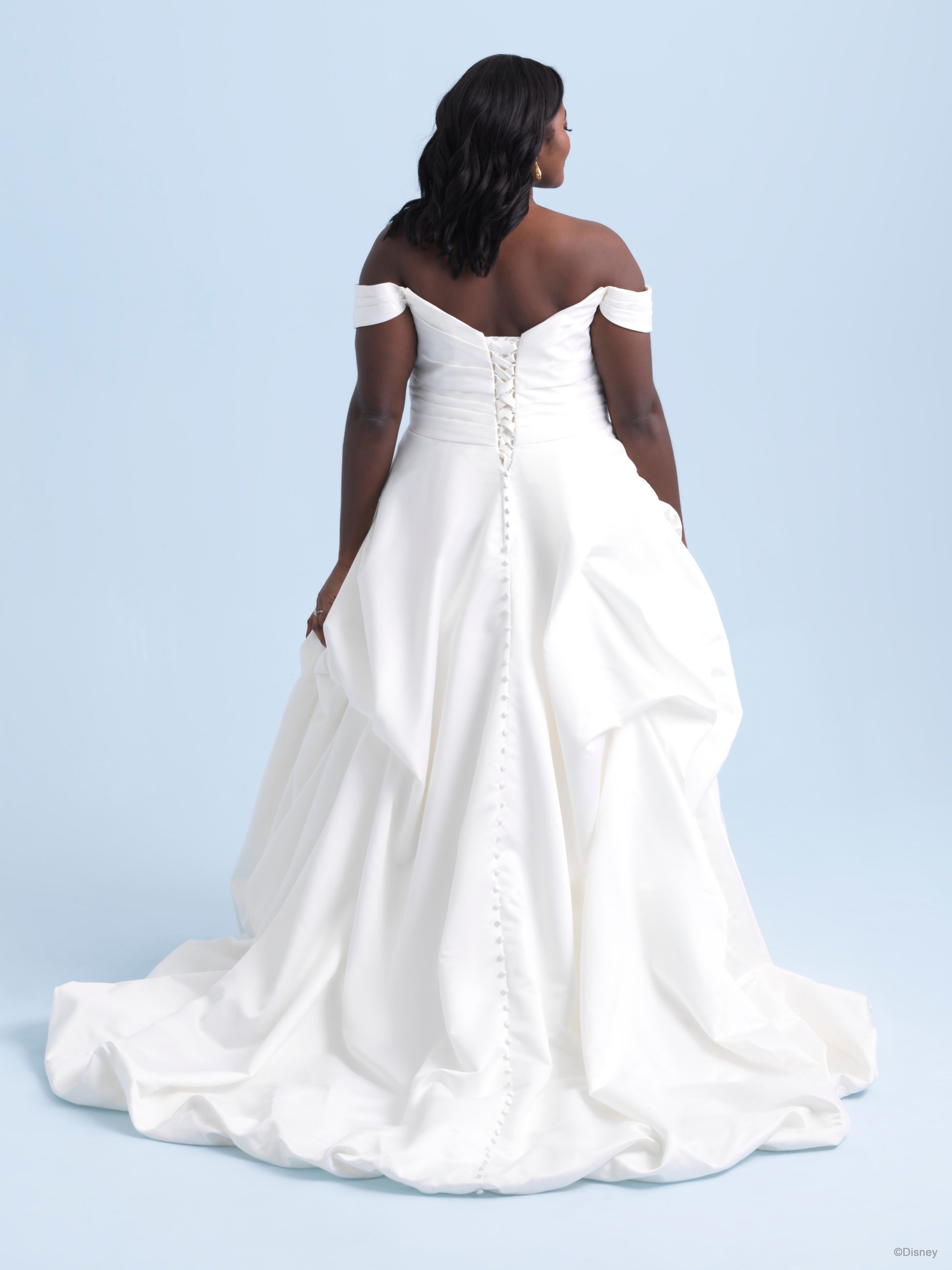 The Belle-inspired ballgown finds its inspiration in the unforgettable lines of Belle's candlelit gown. This draped, off-shoulder satin gown is flawlessly textured, with ruching along the corseted bodice and gathered pickups across the voluminous skirt.