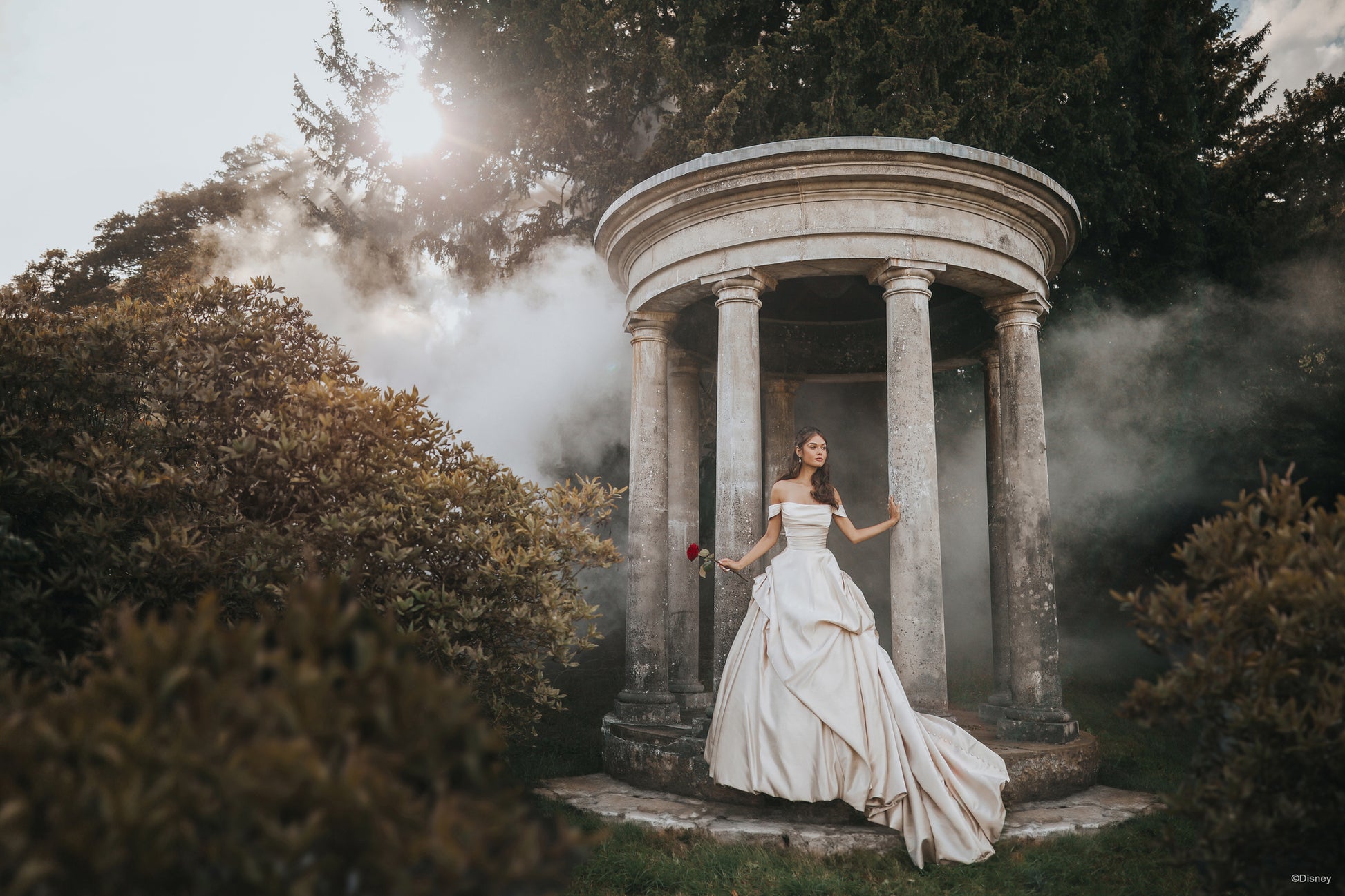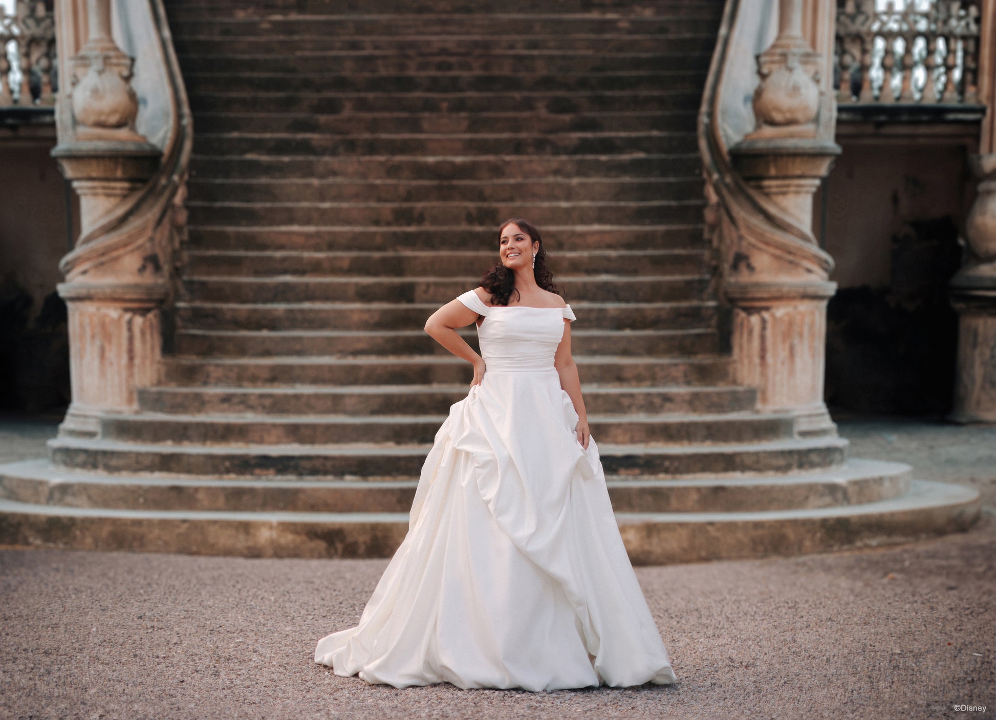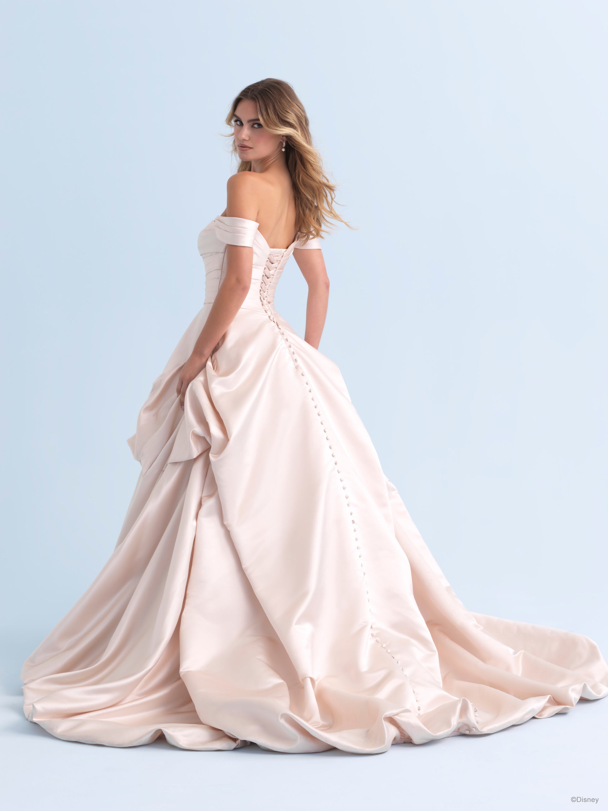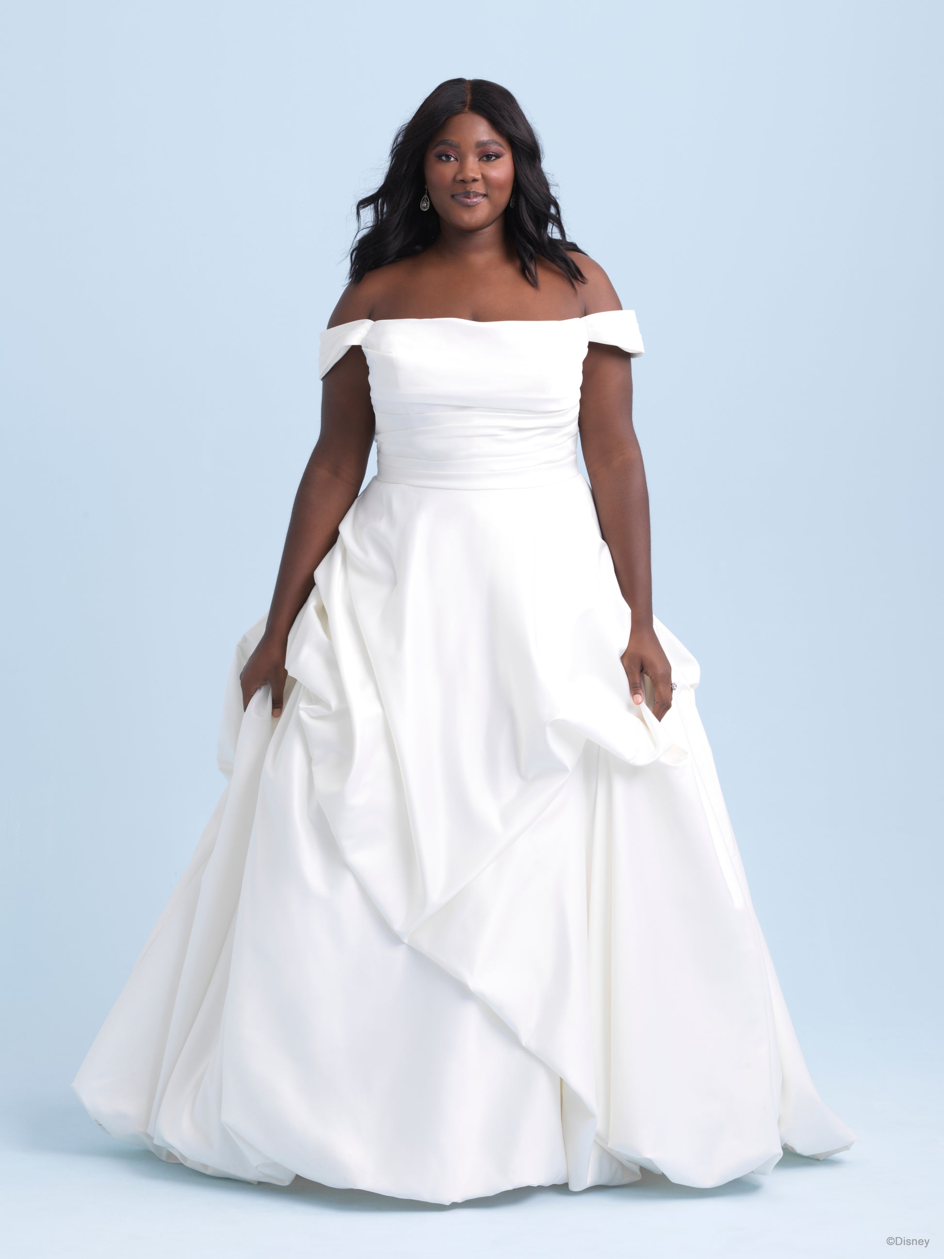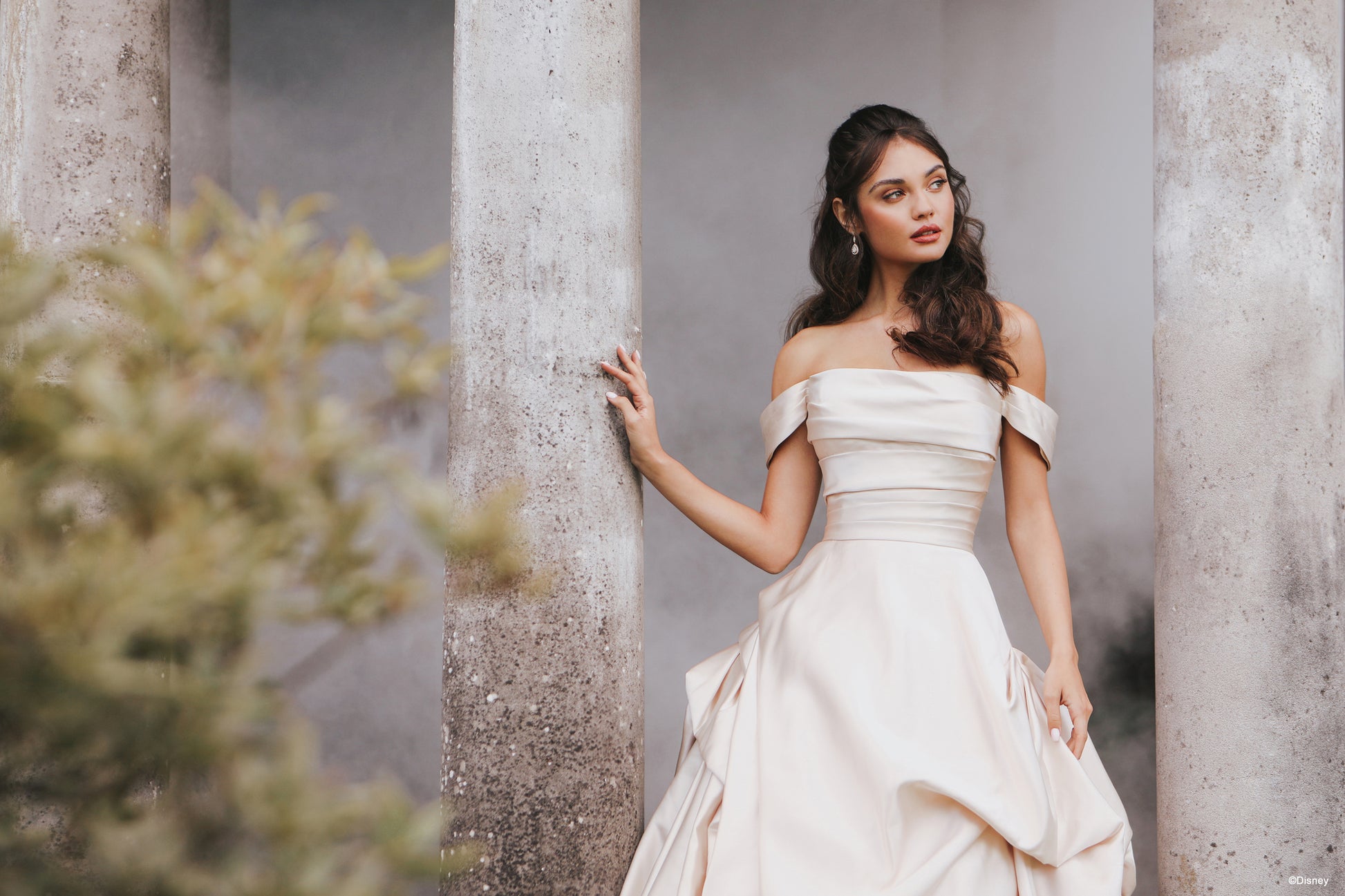 The Belle-inspired ballgown finds its inspiration in the unforgettable lines of Belle's candlelit gown. This draped, off-shoulder satin gown is flawlessly textured, with ruching along the corseted bodice and gathered pickups across the voluminous skirt.