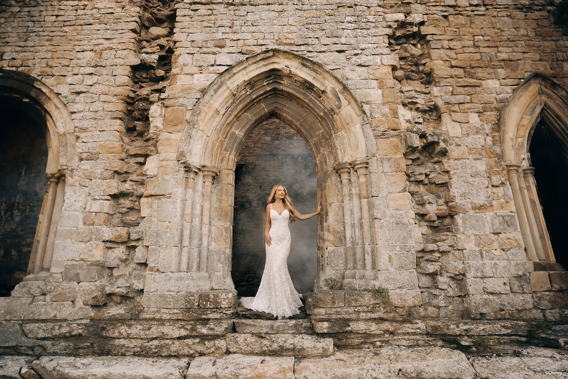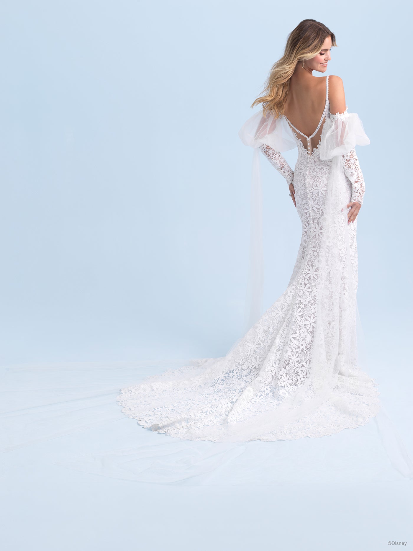 Trailing tulle ribbons are beautifully delicate, yet dramatic, along the Juliet sleeves of this Rapunzel-inspired lace gown. Sleeves sold separately as D416SL.