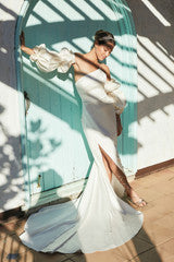 Designed to complement the airy lace of Couture style C789, this detachable train is crafted from structured Mikado for a bold, sculptural contrast. The crisp silhouette adds volume and presence, transforming the gown into a striking ceremony look with the ease of removal for reception-ready simplicity.