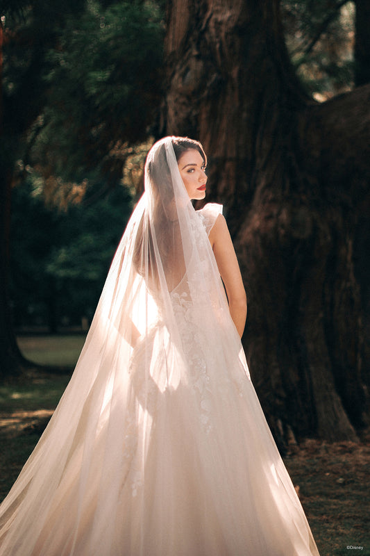 This timeless cathedral-length veil in soft English net is the perfect finishing touch for any fairytale-inspired gown. Its delicate, neutral design gracefully complements each princess-inspired look, while the elegant bow detailing adds a hint of romance and charm. Flowing beautifully down the aisle, this veil creates an ethereal silhouette that enhances your gown's details without overshadowing them, making it an ideal accessory for a bride ready to live her own happily ever after.