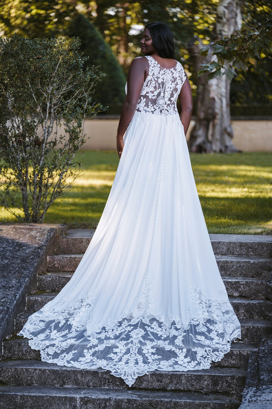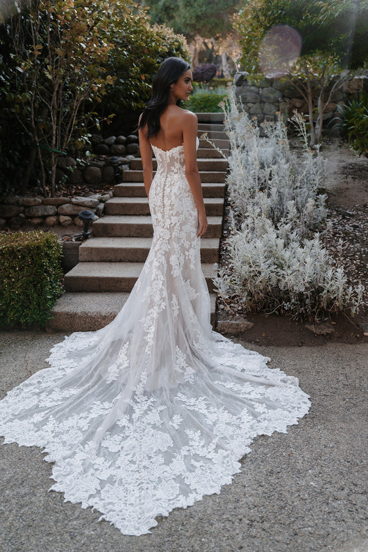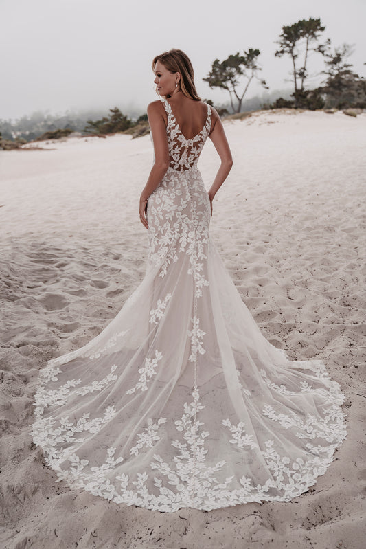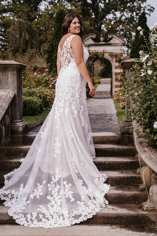 The Allure 9956 is a romantic A-line wedding dress showcases floral beauty. Lacy appliqués adorned with blooms cover the gown, creating a striking and delicate appearance. The dress features a flowing tulle train, enhancing its dreamy allure. The combination of florals, lace, and tulle embodies a captivating and ethereal bridal look.