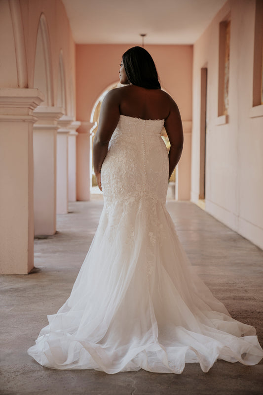 The Allure 9953 has a fit-and-flare sheath that combines elegance with texture. The strapless bodice features rich beading and appliqués, creating a luxurious focal point. Below, sparkling tulle adorned with a Swiss dot pattern adds depth and visual interest. The gown's silhouette accentuates curves while the varied textures create a stunning, multidimensional bridal look.