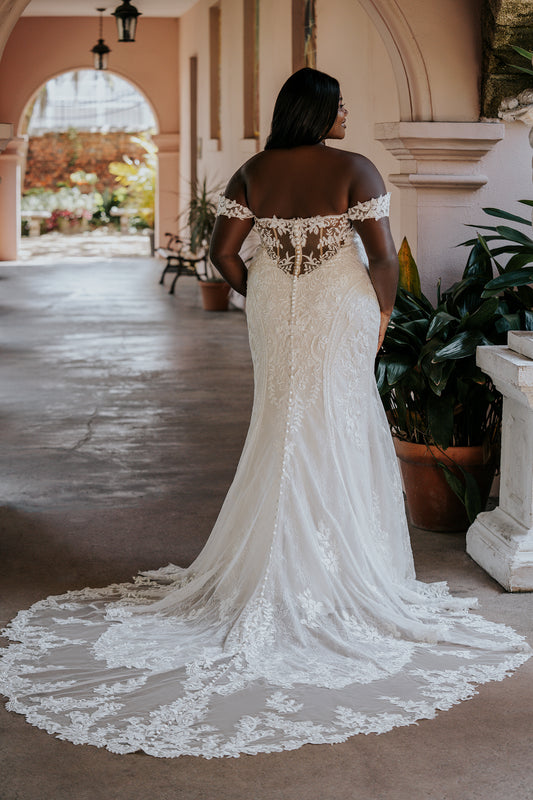 This off-shoulder sheath gown showcases an abundance of floral lace, creating a lush and romantic appearance. The intricate lace detailing adorns the entire dress, emphasizing its striking silhouette. Allure 9962’s combination of the form-fitting sheath style and the lavish floral motifs results in a gown that's both elegant and dramatically beautiful.