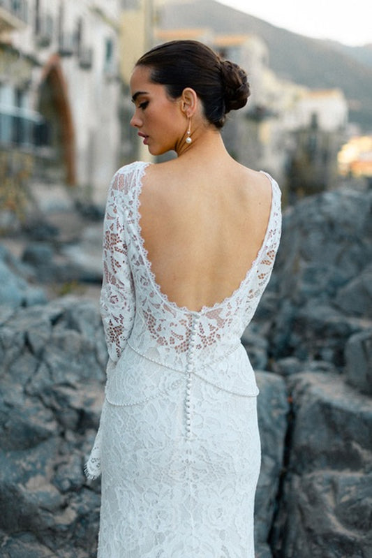 Crafted from sleek, matte crepe, this detachable overskirt adds instant drama and movement to your bridal look. Designed to fasten seamlessly at the waist, it drapes into a clean, modern silhouette—perfect for creating a grand ceremony entrance before revealing your gown’s shape for the reception.