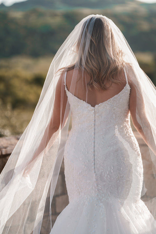 This cathedral-length veil is crafted from airy tulle and finished with soft cotton lace appliques, designed to complement the romantic texture and organic detail of styles C780, A1354, and R3859. Effortlessly elegant, it adds a natural, softly structured finish to any bridal silhouette.