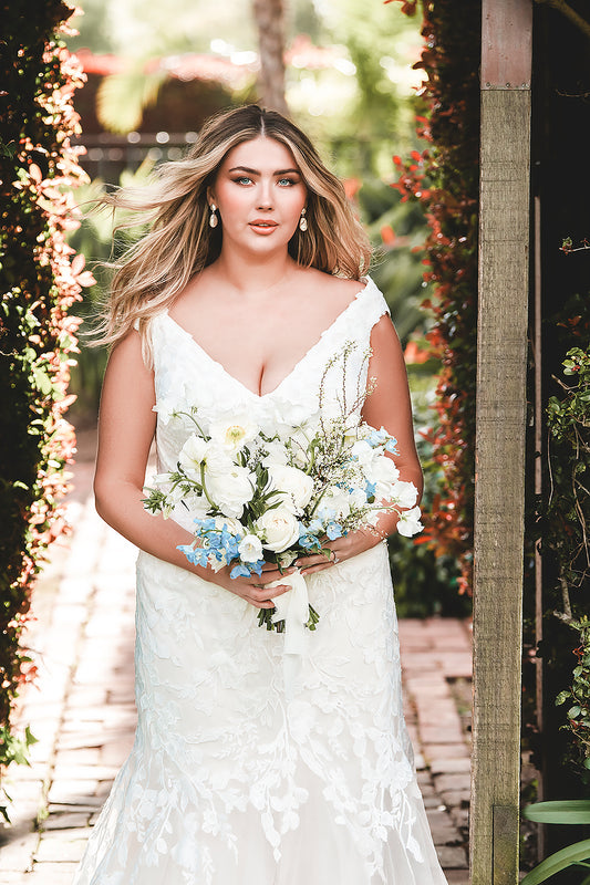 This cathedral-length tulle veil is adorned with scattered floral appliques, perfectly designed to complement the romantic textures of Abella styles E555 and E556. Soft and sweeping, it adds dimension and drama without overpowering—an effortlessly graceful finishing touch for a floral-forward bridal look.