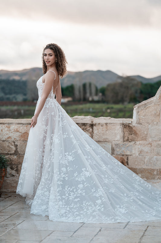Textures abound throughout this dreamy beaded and sequined lace sheath bridal gown, which features removable puffed tulle sleeves for added effect. The bodice’s boning adds structure to the gown, while the fit and flare, mermaid-style skirt shows off your figure. A1310’s intricate lacework and delicate beading make it a true work of art, perfect for the bride who wants to make a statement on her special day. This gown comes in beautiful almond and ivory shades. See A1310 in person by finding a retailer near you.