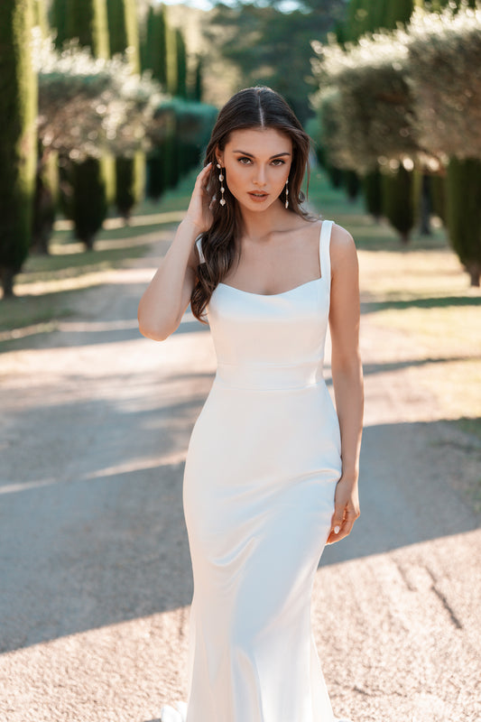 Simplicity at its finest: this stretch satin sheath gown is the loveliest bridal look for an elegant elopement or understated, modern wedding. The A1308 will hug your frame, subtly showing off your natural curves while also adding to the elegance of the gown. This gown is perfect for the bride who wants to make a statement as she walks down the aisle without being too flashy. Visit an Allure Bridals retailer and try on the A1308. Decide if it aligns with your vision of the perfect wedding gown.