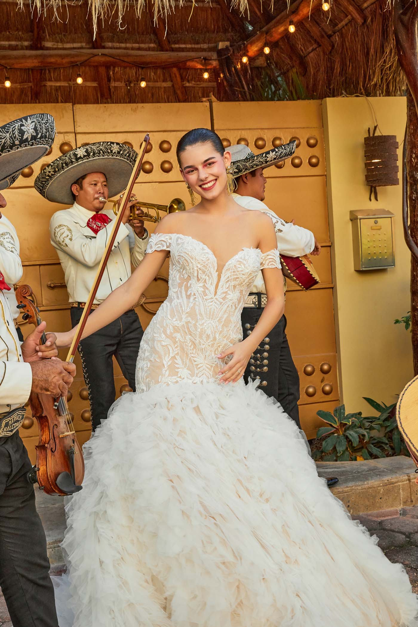 Feathery tulle composes the dimensional skirt of this elegant, opulent mermaid gown.