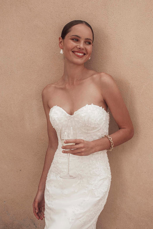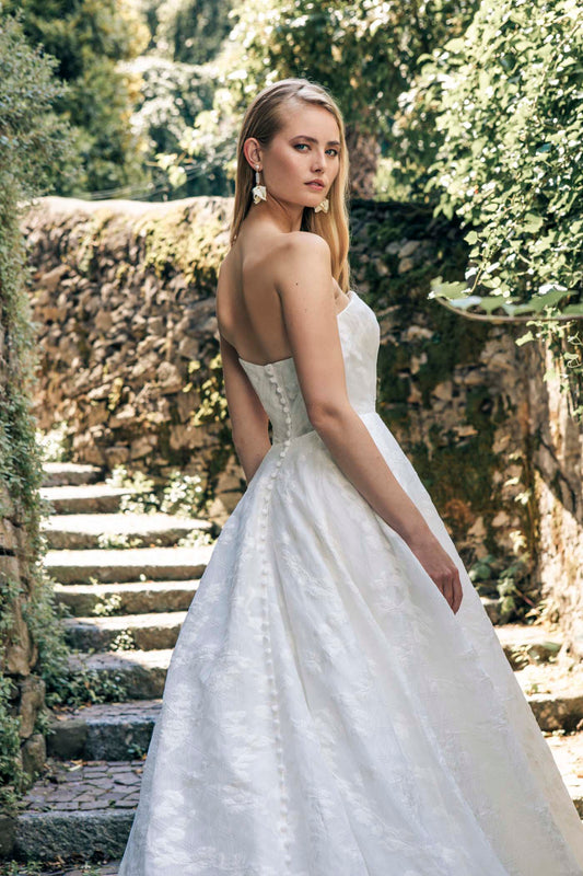 Introducing Gwen — a soft, strapless A-line silhouette composed of romantic sheet lace in a botanical motif, and finished with a subtly gethered tulle bodice.