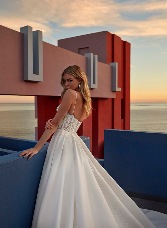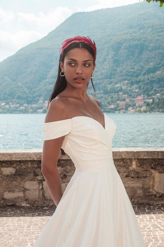 Create your bridal aesthetic with Honor's changeable off-shoulder straps — whether truly classic and minimalist in dove satin or chicly feminine with textured blossoms.