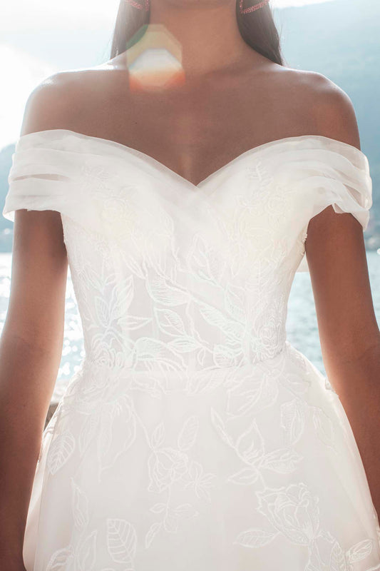 Stunning, voluminous tulle, alternating with sheer organza, gives a peek at the matte lace trailing down Haylee's off-shoulder ballgown silhouette. Detachable organza sleeves are a gorgeous addition. This Madison James MJ1008 gown is also available with detachable sleeves MJ1008SL sold separately. Shop both gown and detachable sleeves when you search for your local Madison James retailer today.