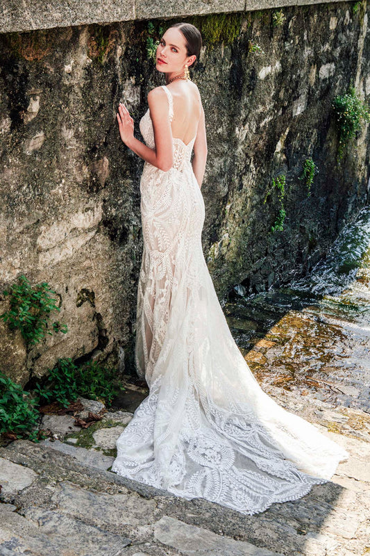 Botanical lace appliques, sequins and tonal beadwork adorn the dramatic fit and flare silhouette of the Gianni gown.