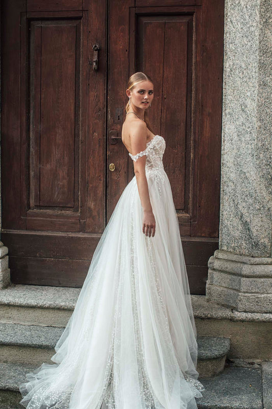 Our delicate Hopkins gown is composed of multilayered tulle skirting, which offers a peek at the dimensional sparkling floral fabric featured along the off-shoulder bodice.