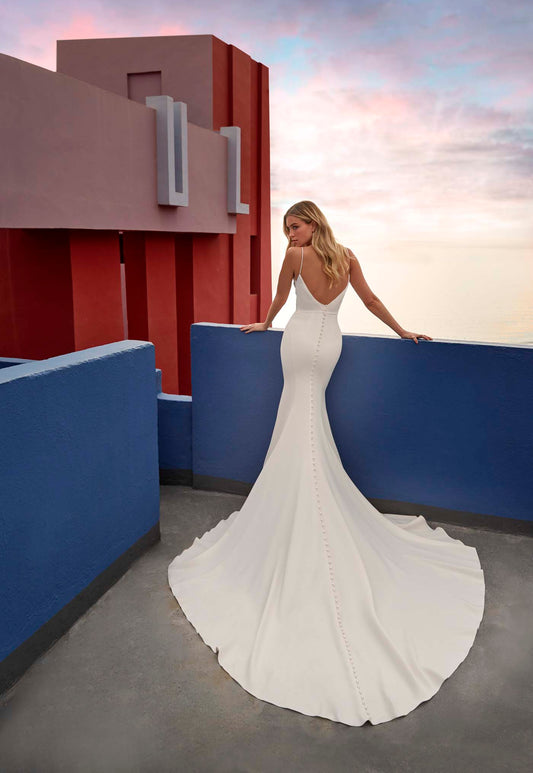 Subtly striking, Hera is a crepe bridal sheath appliqued with understated sequined, beaded dimensional lace over the glitter tulle of its strapless, sweetheart bodice.
