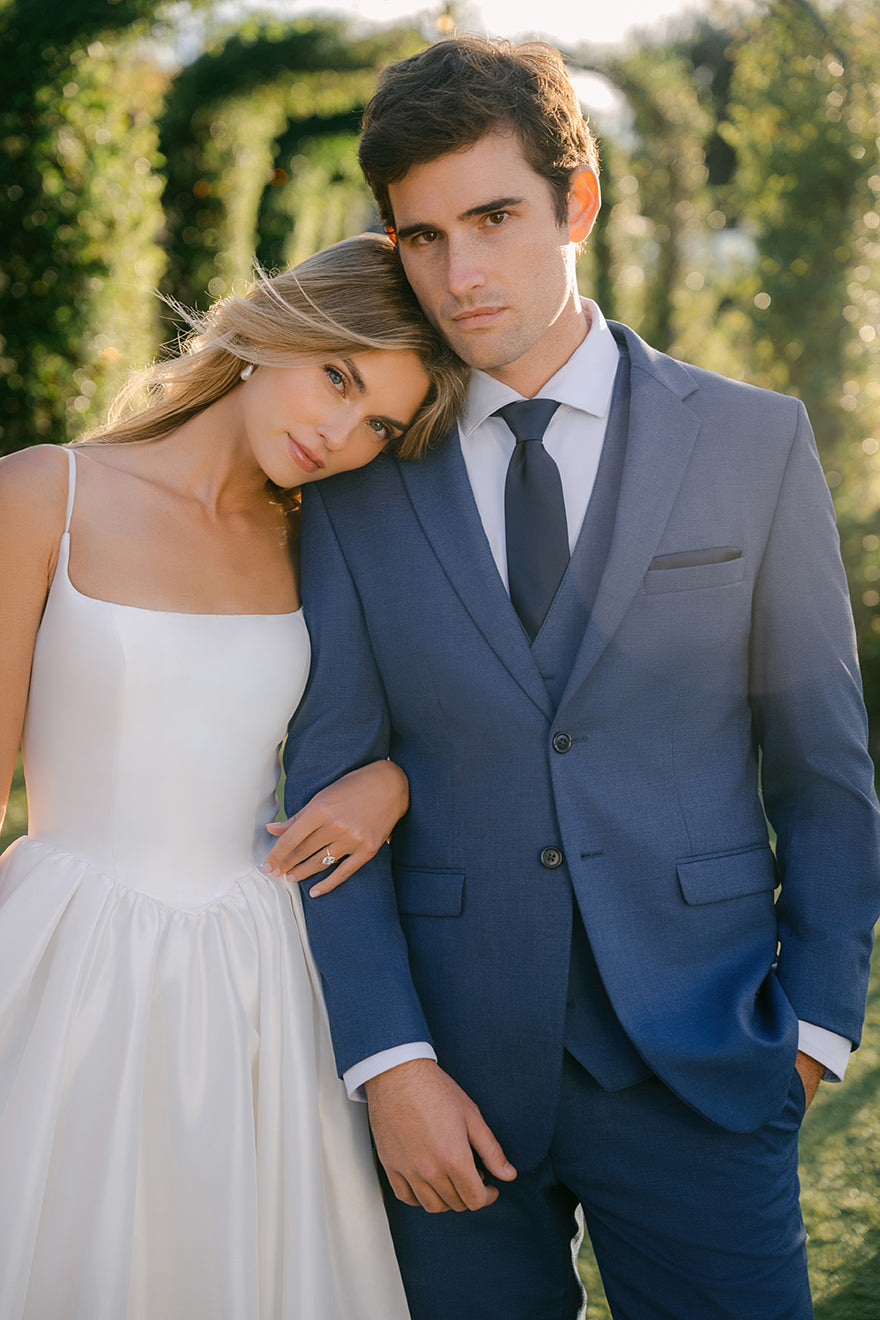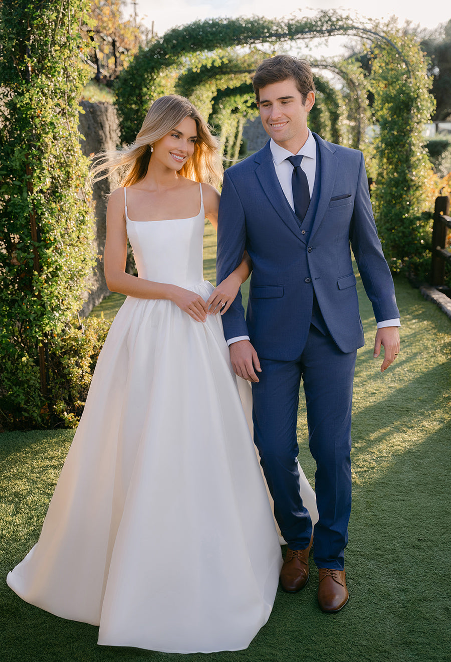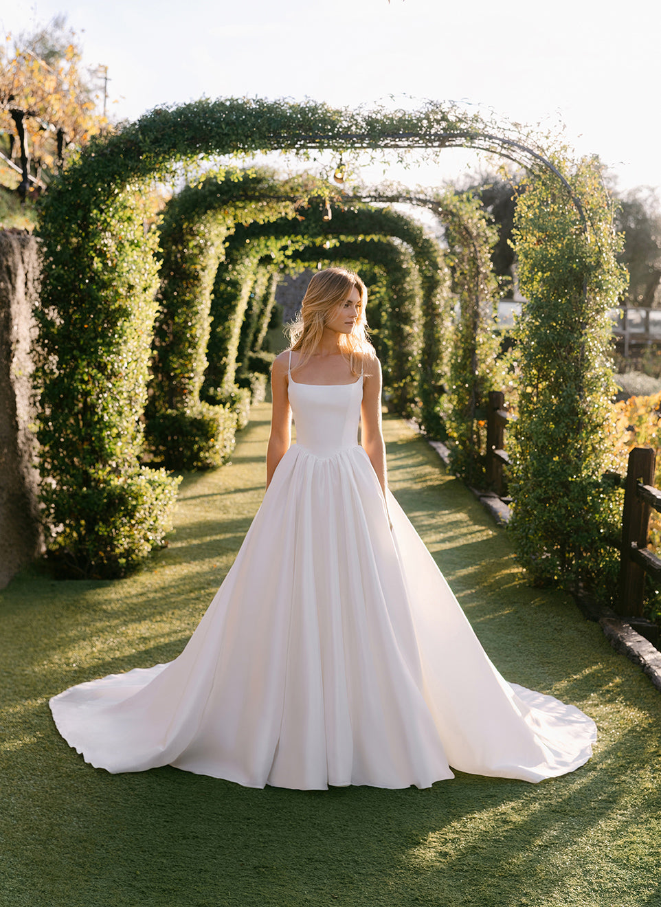 Effortlessly polished, this Mikado ballgown features a ballet neckline and delicate spaghetti straps for a refined yet modern silhouette. The structured bodice and basque waist sculpt the figure before flowing into a voluminous skirt that moves with graceful presence. Minimalist in detail yet rich in design, this gown embodies understated luxury for the bride who values clean lines and timeless craftsmanship. Photographed with veil V40, Sold separately. Read Less