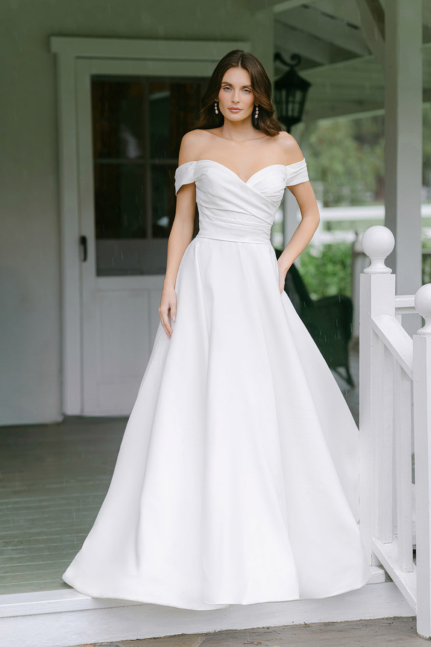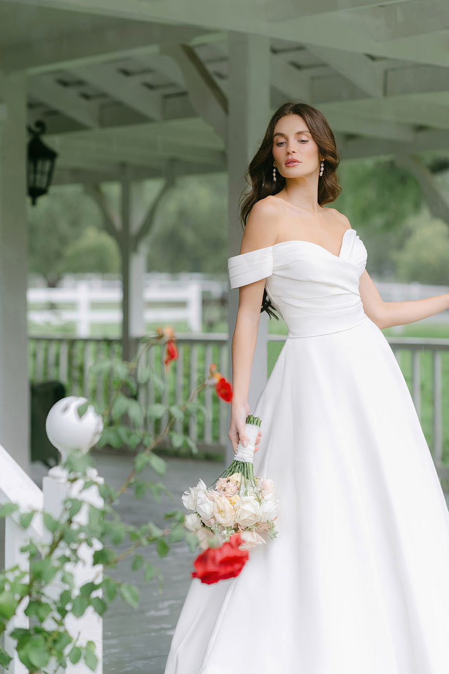 Create your bridal aesthetic with Honor's changeable off-shoulder straps — whether truly classic and minimalist in dove satin or chicly feminine with textured blossoms.