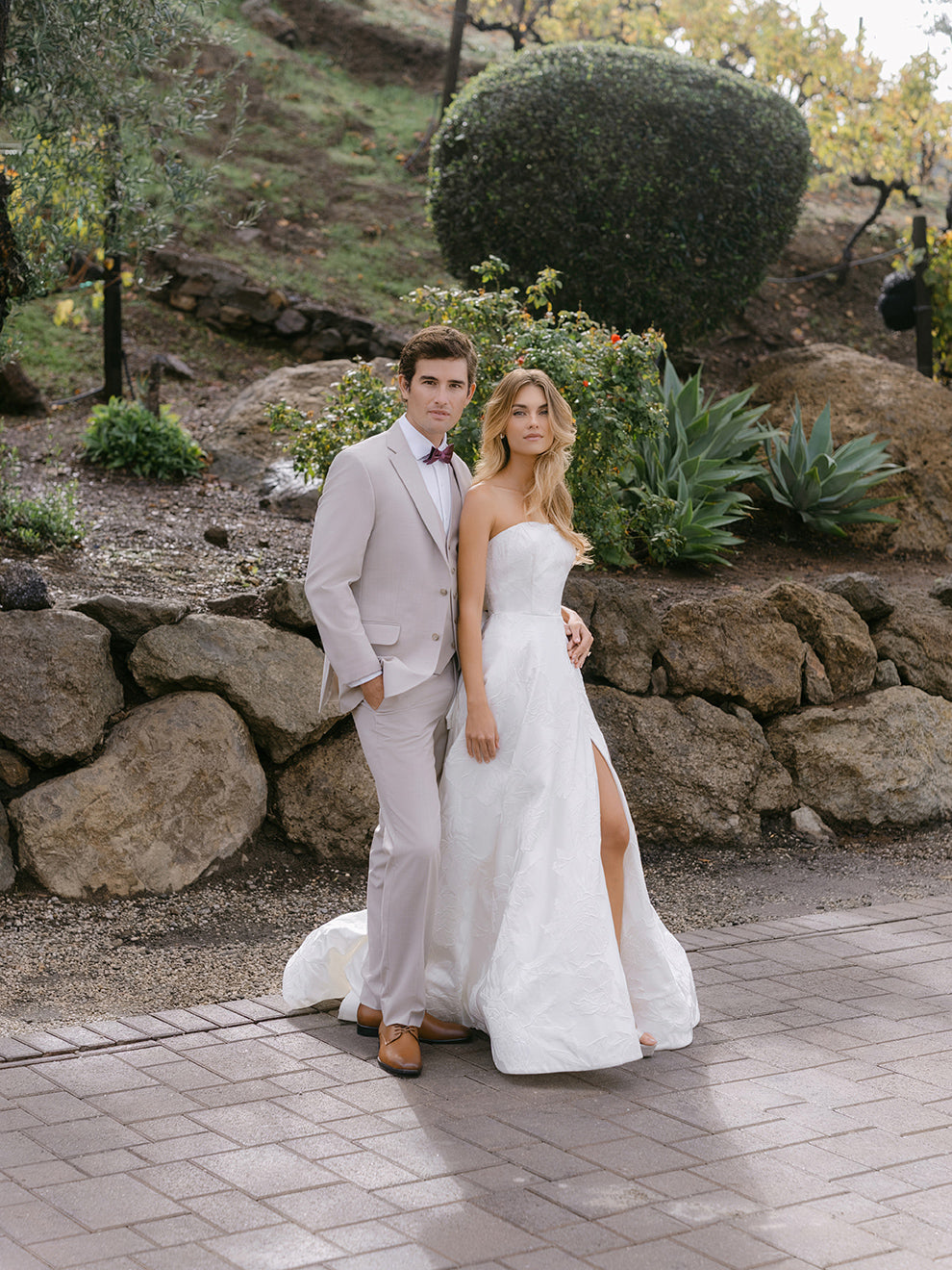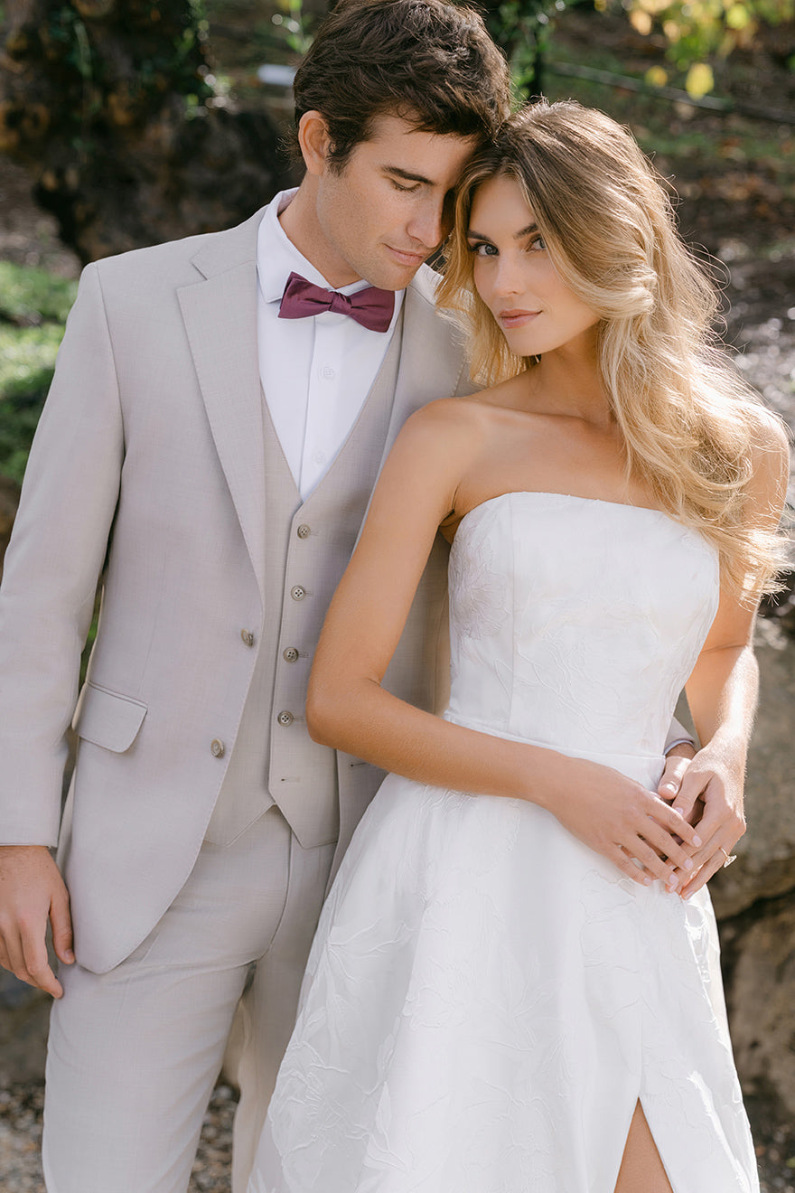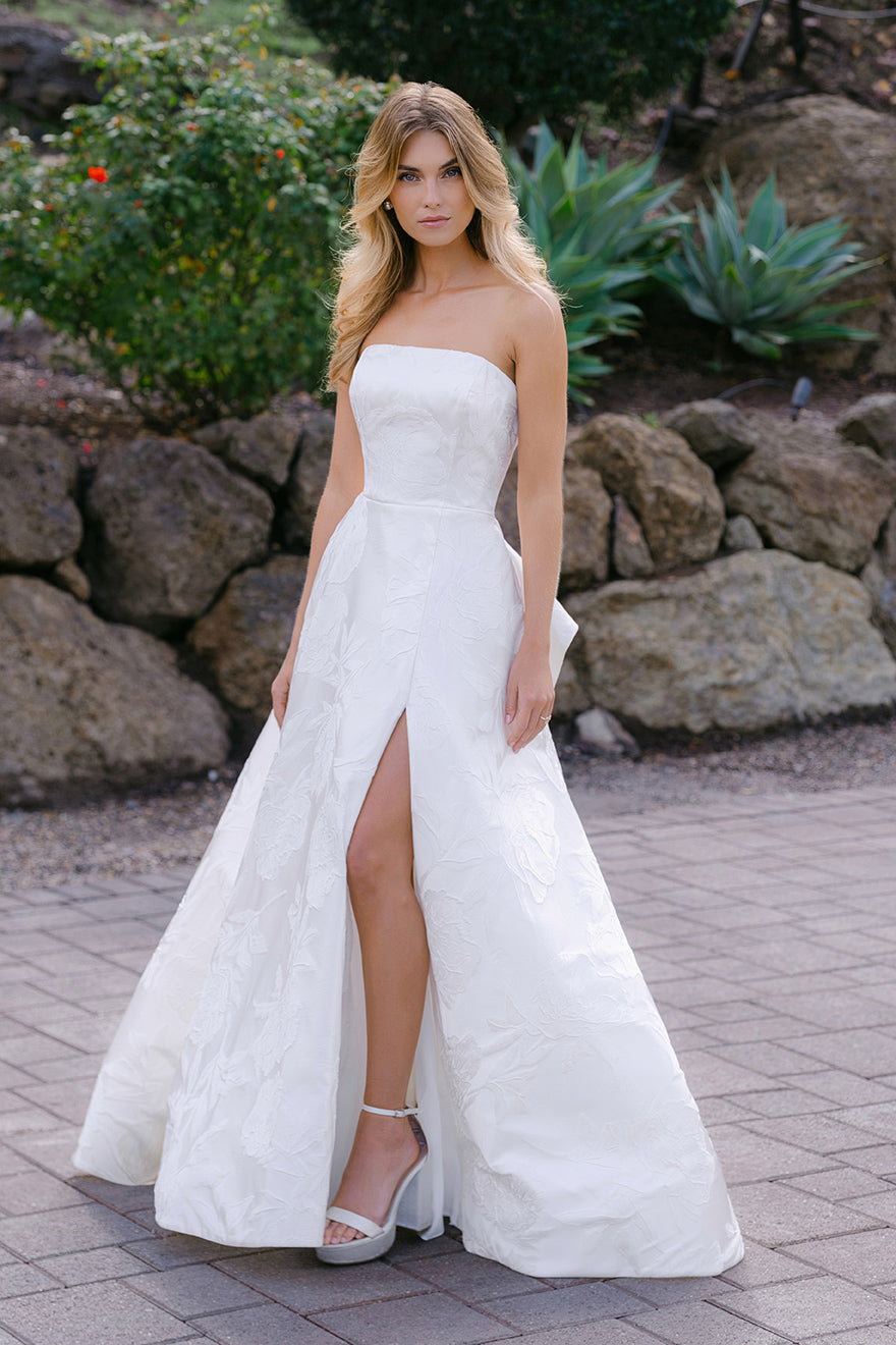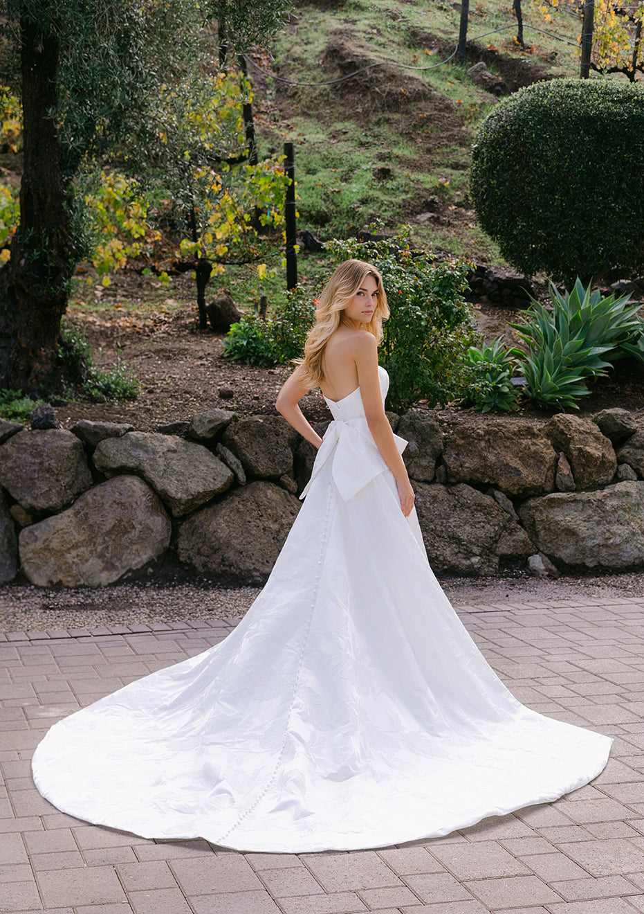 The Gillian ballgown is composed of textured floral jacquard satin and finished with a bow along the back.
