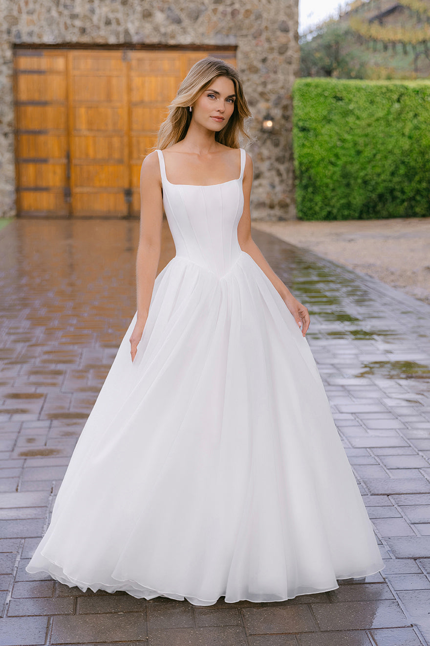 Sleek and airy, this ballgown pairs a structured crepe bodice with a full, flowing organza skirt. The square neckline and wide straps create a modern, flattering frame, while the basque waist defines the silhouette with soft structure. The contrast of smooth crepe and ethereal organza brings a sense of balance—polished, feminine, and effortlessly romantic. Read Less