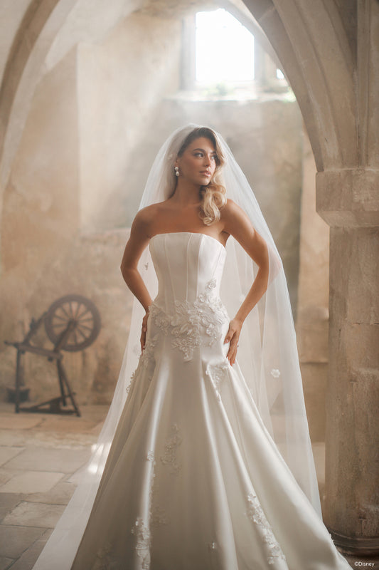 Awakened by love and guided by destiny, Aurora’s story reminds us that even the deepest dreams can bloom into something extraordinary. This satin A-line gown channels her fairytale grace with a sculpted bodice and basque waist, creating a regal, defined silhouette. Soft 3D floral appliqués blossom across the skirt like an enchanted forest coming to life, while the crescent neckline evokes the moment Aurora opens her eyes to a world renewed — a gown that celebrates hope, renewal, and the magic of dreams realized.