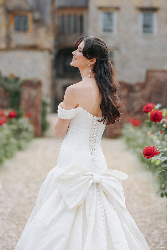 Completing the look, a soft yet structured organza bow drapes elegantly at the back — a whimsical flourish that mirrors Snow White’s joyful spirit. The bow, sold separately as Style D467B, adds a magical finishing touch to this fairytale design, celebrating the beauty of kindness, courage, and love everlasting.