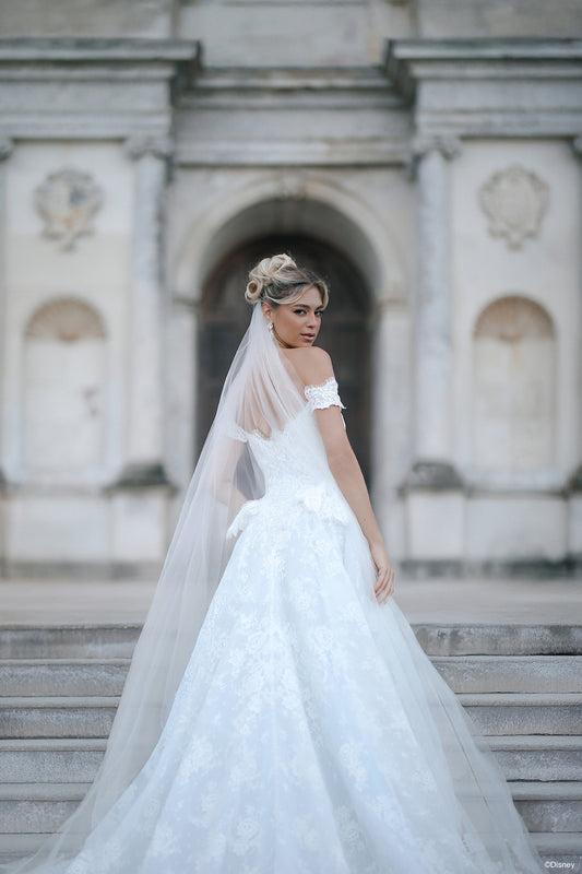 Complete your fairytale look with this cathedral-length veil, designed to perfectly complement the Cinderella-inspired gown. Crafted from airy tulle and adorned with intricate lace along the edge, it mirrors the gown’s romantic detailing with effortless grace. Flowing elegantly behind you, this veil adds a touch of timeless enchantment — the finishing piece for a bride ready to make her own grand entrance.