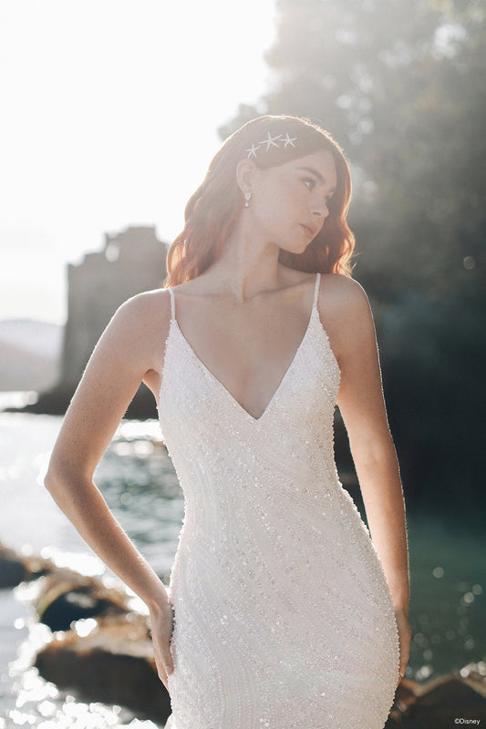 Curiosity and courage define Ariel’s journey as she discovers a world beyond the sea. This shimmering sheath gown captures that spirit of adventure, with tonal beading and sequins that glisten like sunlight dancing on the water. A soft sweetheart neckline and elegant slit bring modern grace to the silhouette, while detachable long sleeves offer a versatile touch — reflecting Ariel’s transformation and the beauty of finding your own voice.