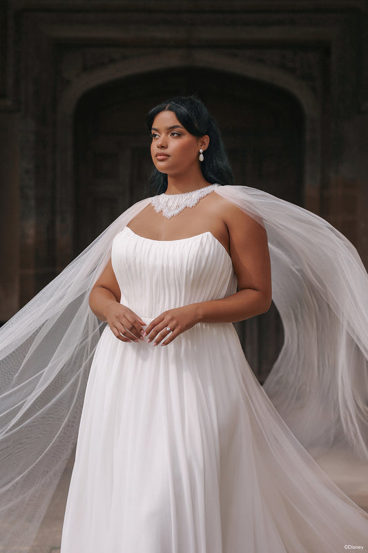Light and full of movement, this chiffon gown reflects Jasmine’s free-spirited nature and bold heart. The softly peaked scoop neckline and ruched bodice create a graceful, confident silhouette, while the flowing chiffon skirt drapes effortlessly — capturing the sense of freedom and wonder that defines her story. Like Jasmine herself, this gown embodies the courage to chase new horizons and the beauty of following your own path.
