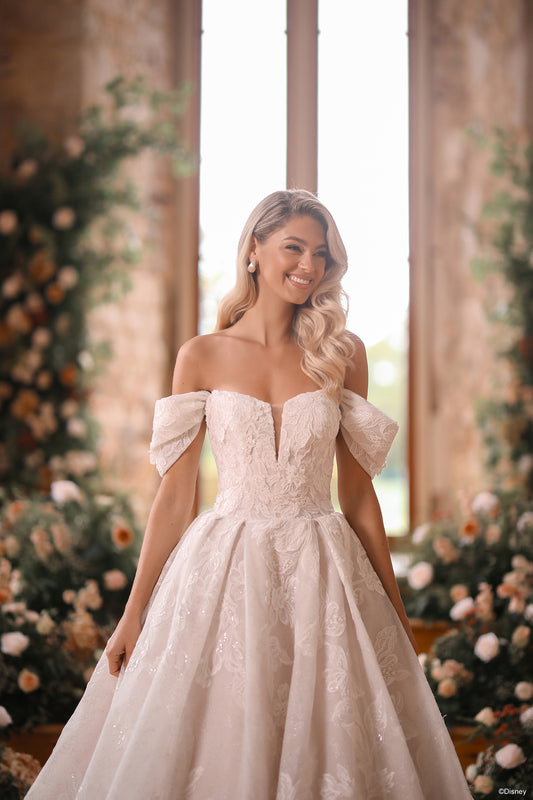 Shimmering with a touch of magic, this soft A-line gown evokes Jasmine’s bold spirit and radiant charm. Crafted from delicate sparkle tulle, it catches the light with every movement, while intricate beaded lace appliqués trace the bodice and flow gently onto the skirt. The sweetheart off-the-shoulder neckline adds an air of effortless romance, perfectly blending elegance and adventure for the bride ready to embrace her own fairytale journey.