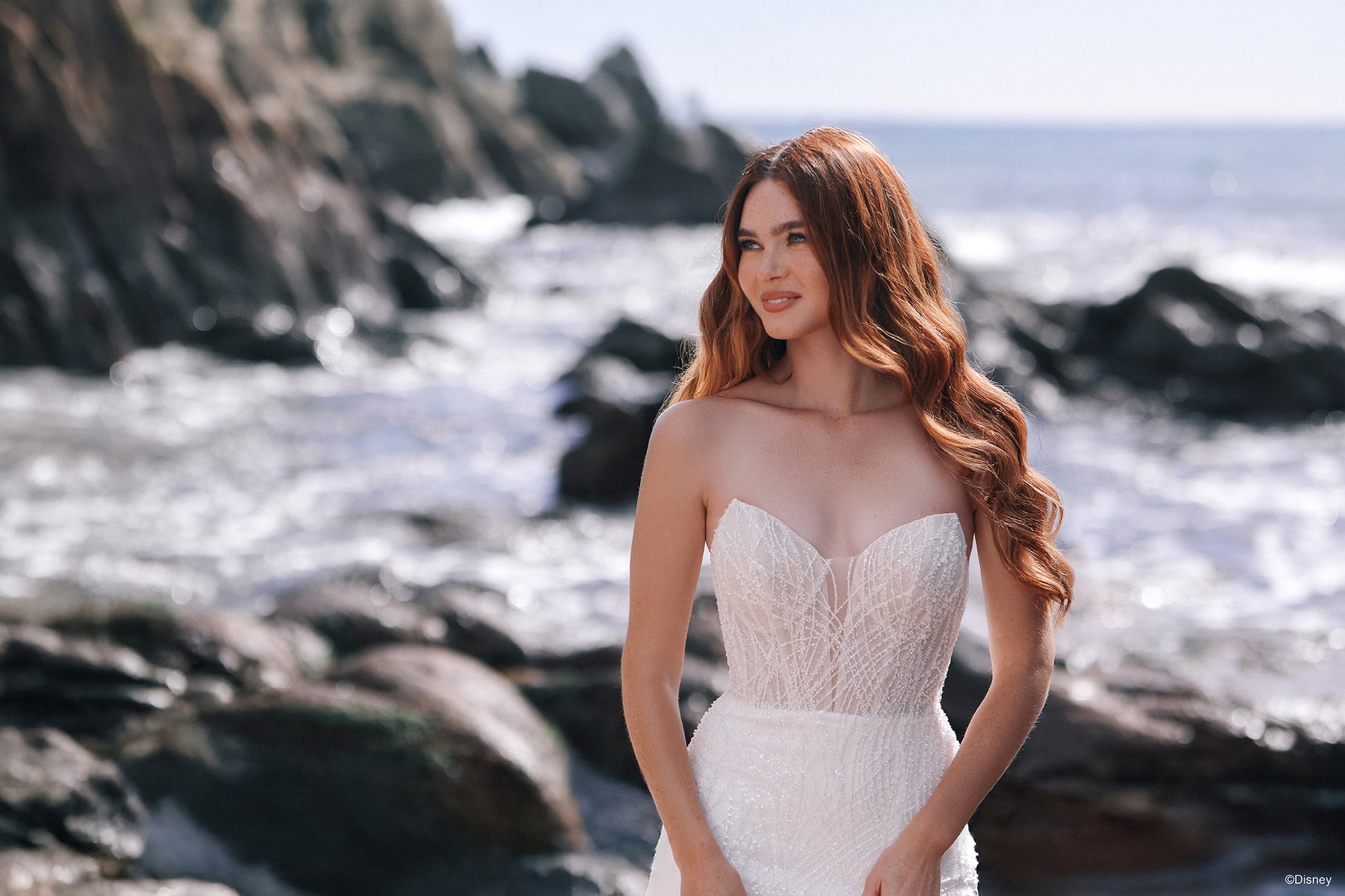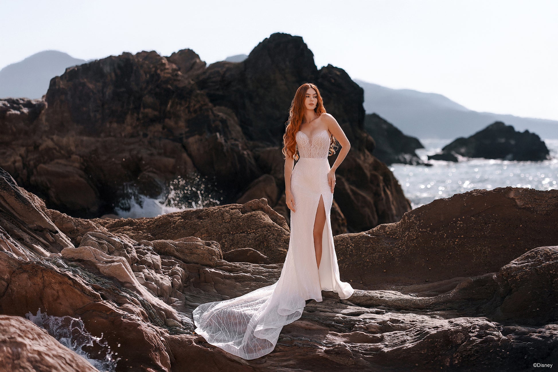 Curiosity and courage define Ariel’s journey as she discovers a world beyond the sea. This shimmering sheath gown captures that spirit of adventure, with tonal beading and sequins that glisten like sunlight dancing on the water. A soft sweetheart neckline and elegant slit bring modern g... Read More