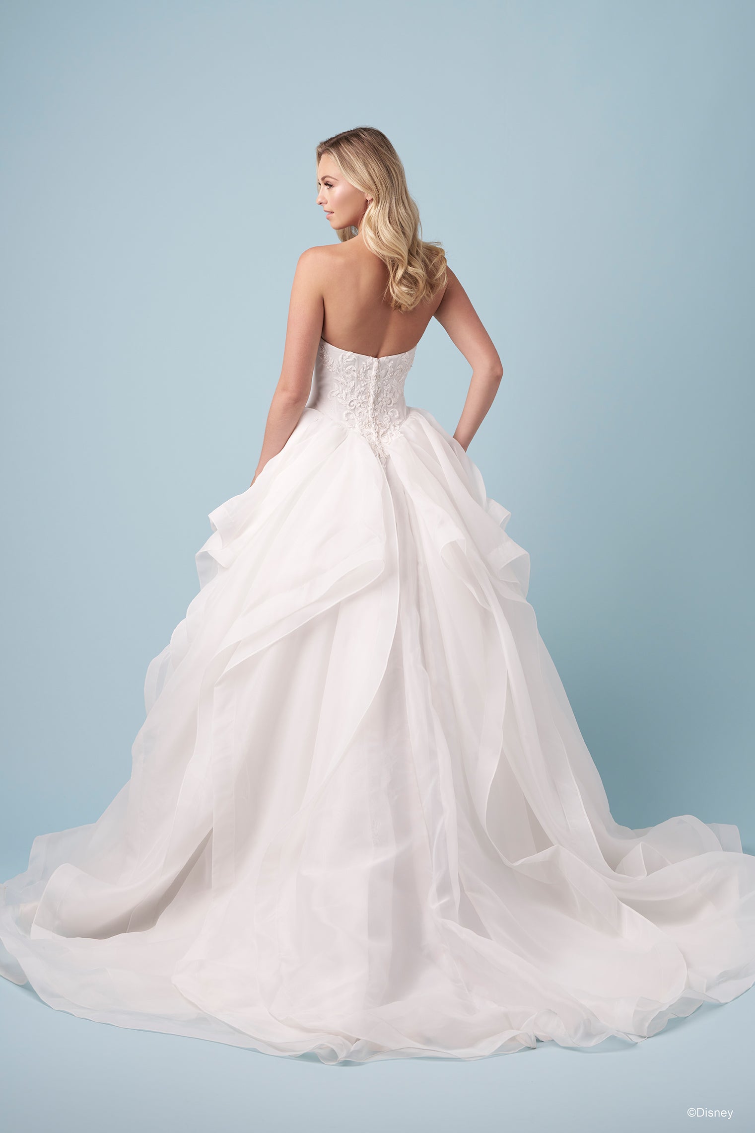Shimmering in soft platinum with hints of cool blue, this organza ballgown evokes the moment Cinderella’s dreams take shape beneath the starlit sky. The beaded bodice sparkles like a wish granted, while delicate scrolls mirror the graceful curves of her enchanted carriage. A basque waist and cateye neckline sculpt a regal silhouette, leading to a ruffled skirt that swirls with the magic of movement — a gown that captures the wonder of transformation and the beauty of believing in what’s possible. Read Less
